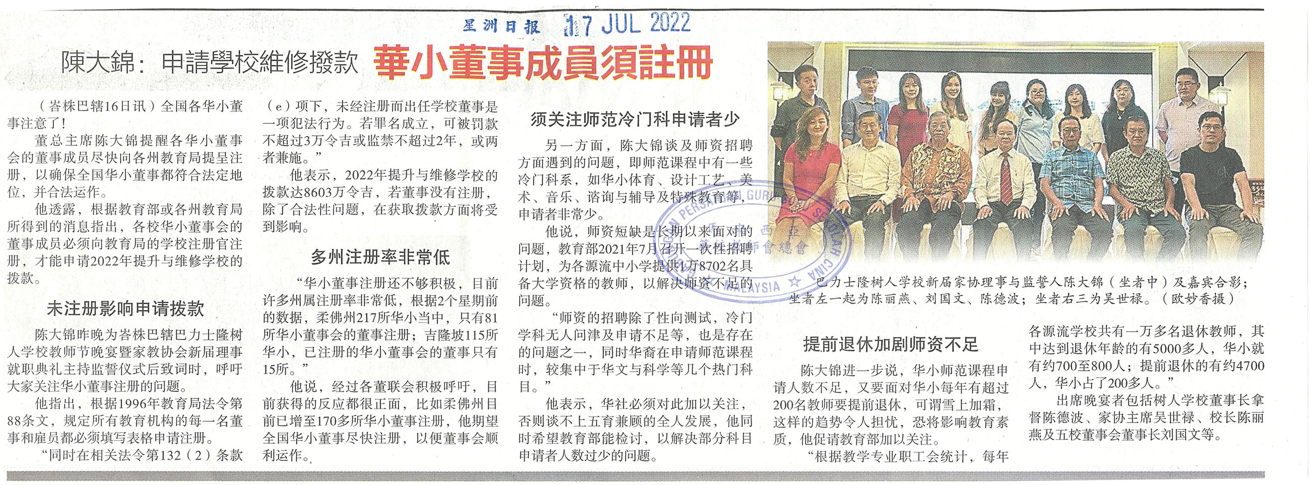 陈大锦:申请学校维修拨款 华小董事成员须注册 WhatsApp 上一篇文章: 教育部长:修复失修校舍 尽快转移校地所有权 上一页 下一篇文章: 师范录取率偏低 华裔校长接班人难寻 霹董联忧华中变质 下一页