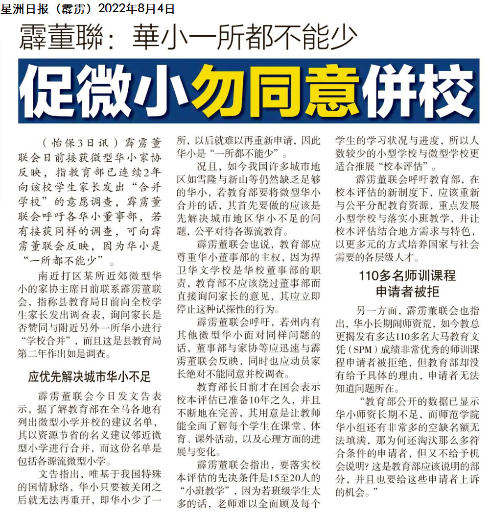 霹雳董联:华小一所都不能少 促微小勿同意并校