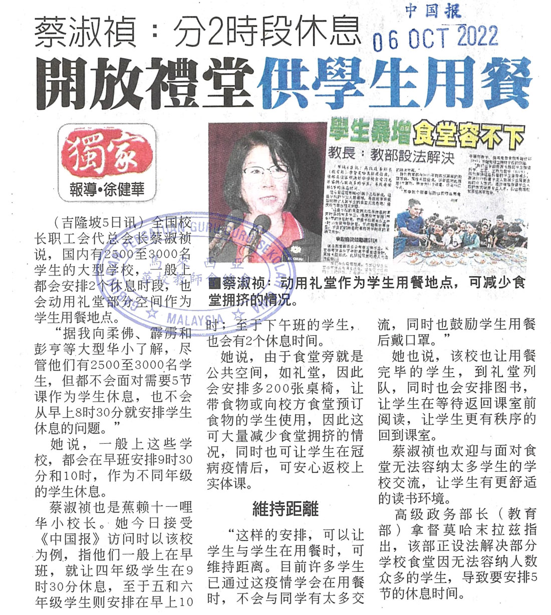蔡淑祯:分2时段休息 开放礼堂供学生用餐