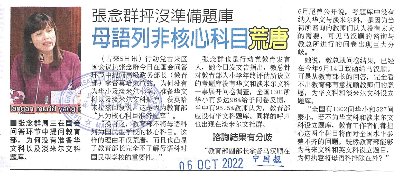 张念群抨没准备题库 母语列非核心科目荒唐 WhatsApp 上一篇文章: 全国教总主席谢立意希望中央认真看待华社需求 承认统考 固定拨款 支持独中发展 上一页 下一篇文章: 蔡淑祯:分2时段休息 开放礼堂供学生用餐 下一页