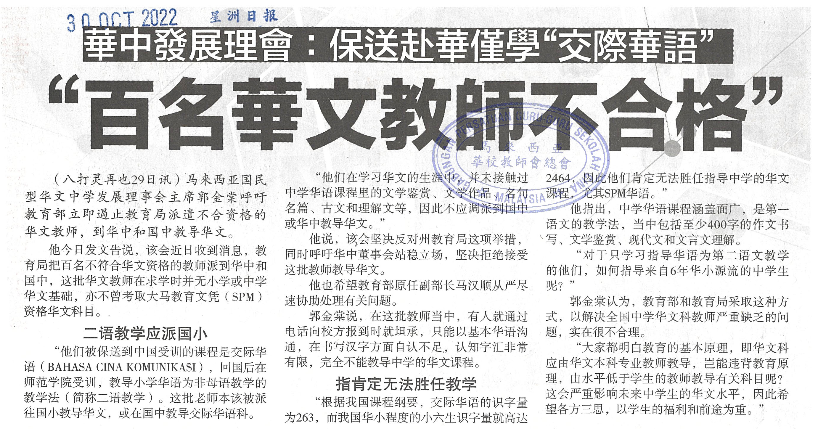 华中发展理事会:保送赴华仅学“交际华语” 百名华文教师不合格 WhatsApp 上一篇文章: 马汉顺:官员没查清楚背景 错派华中教师将调走 上一页 下一篇文章: 陈大锦:若有意承认应言出必行“勿再让统考成箭靶” 下一页