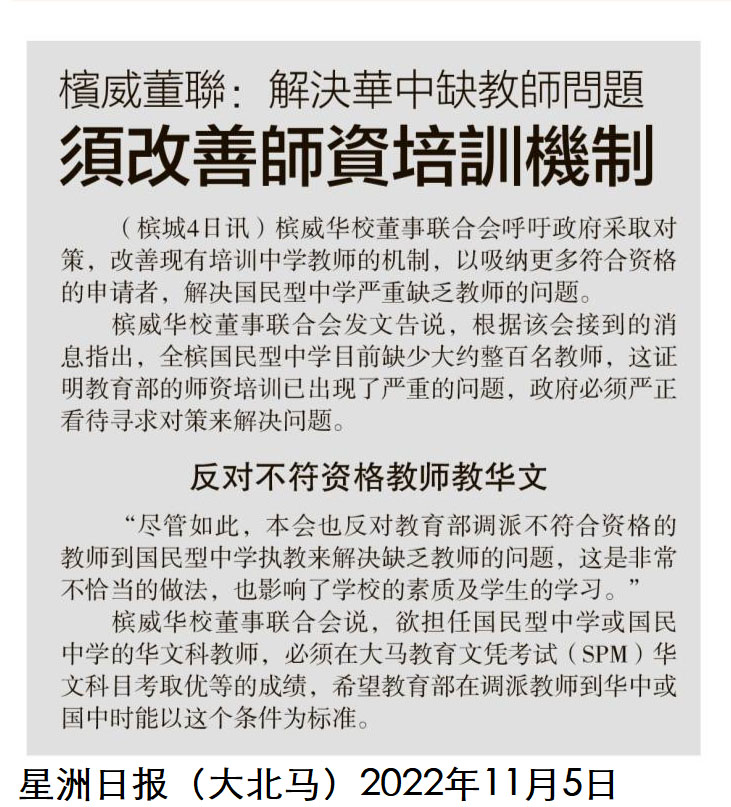 槟威董联:解决华中缺教师问题 须改善师资培训机制