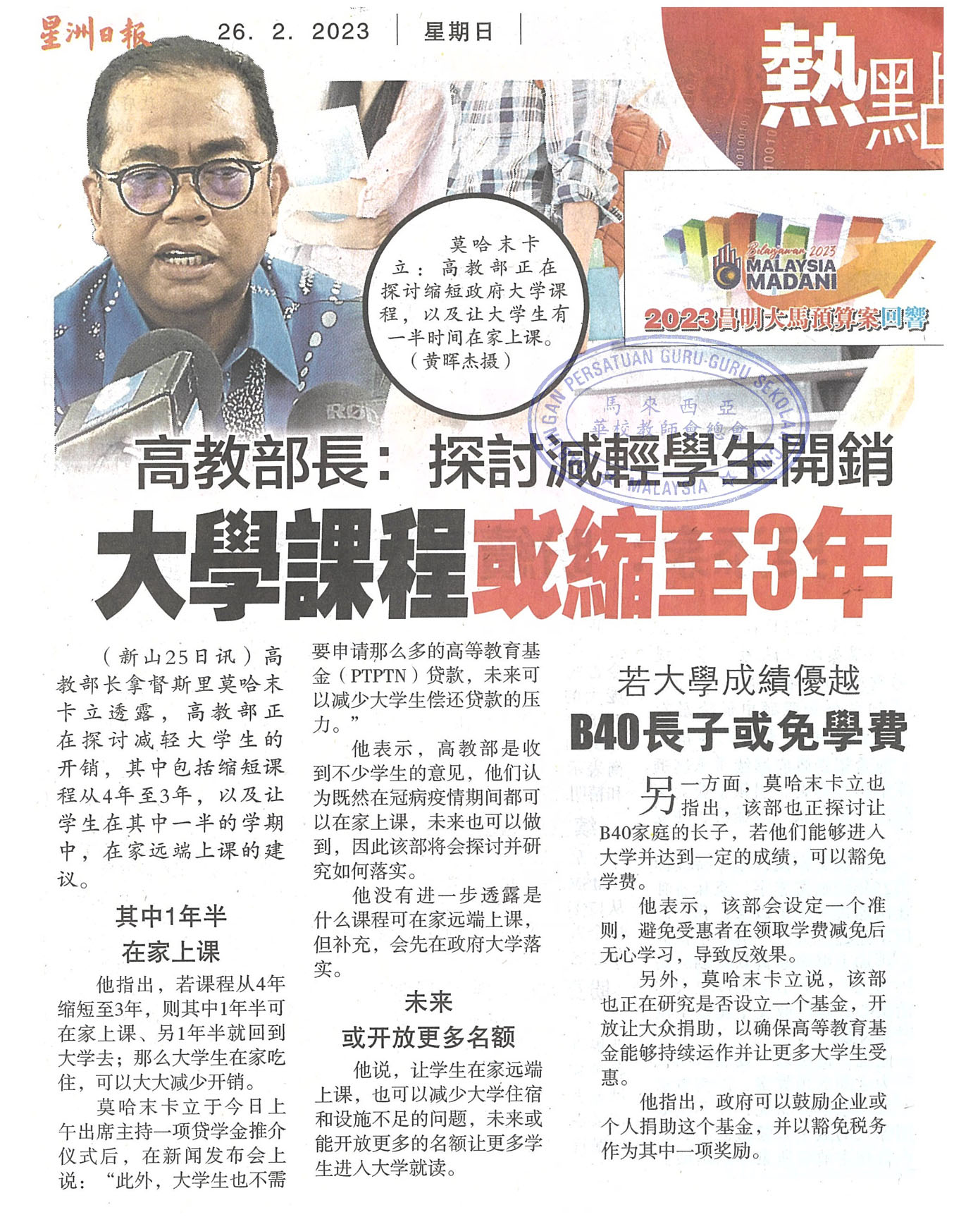 高教部长:探讨减轻学生开销 大学课程或缩至3年 WhatsApp 上一篇文章: 董教总:教育部获552亿最多 促详列各源流学校拨款 上一页 下一篇文章: 教长:拨款维修残旧学校 让迫切需要学校受惠 下一页