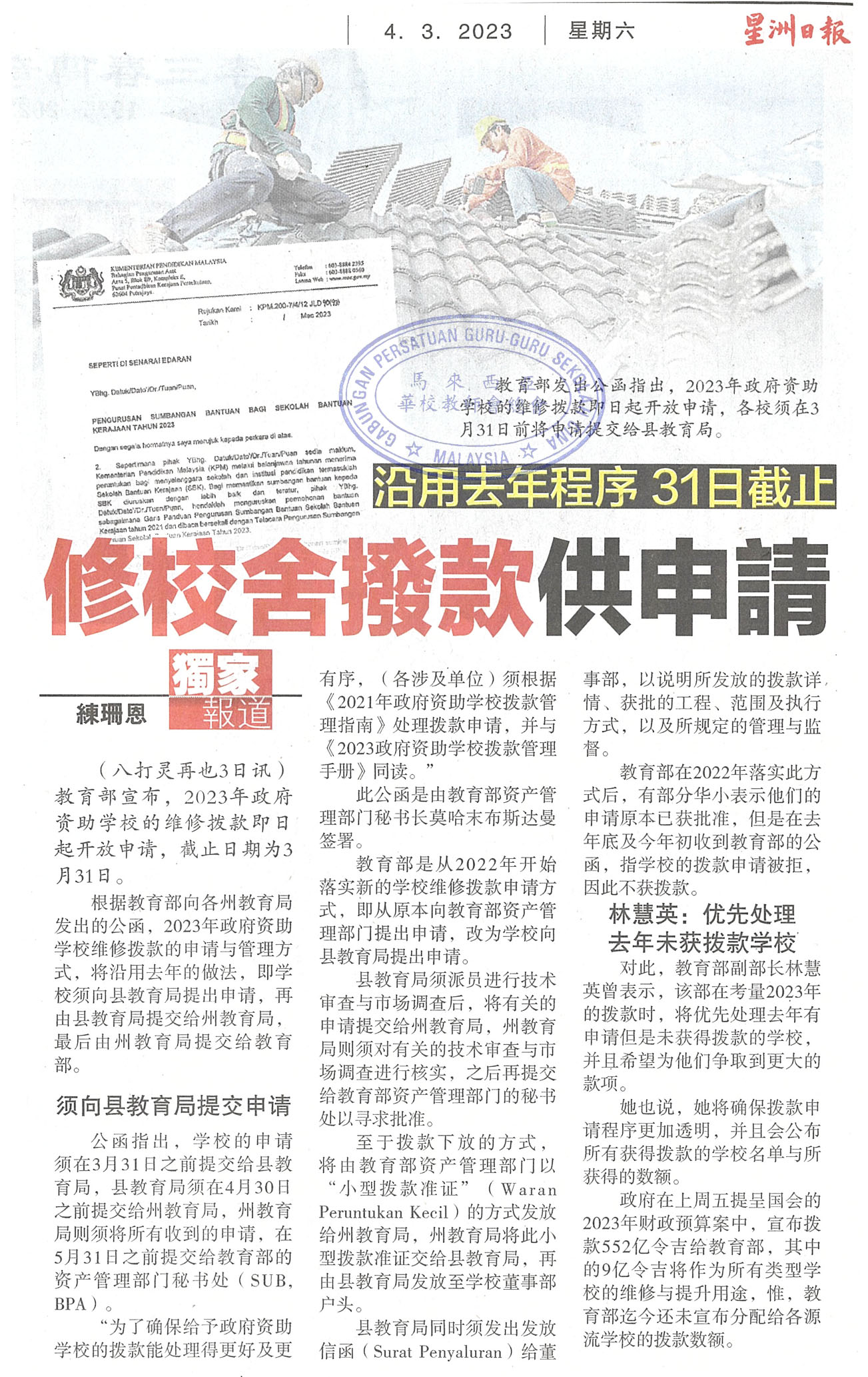 沿用去年程序 31日截至 修校舍拨款供申请