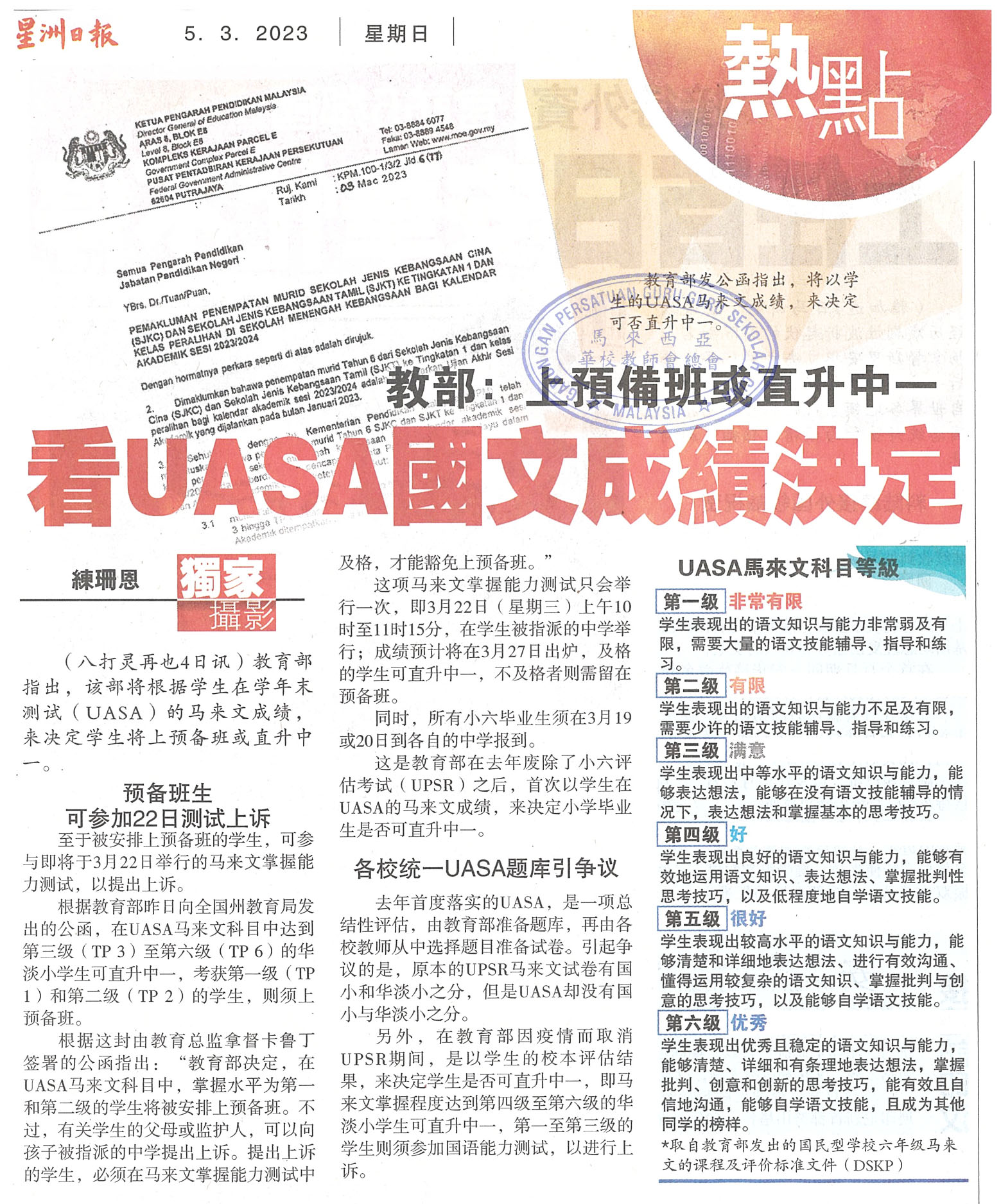 教育部:上预备班或直升中一 看UASA国文成绩决定