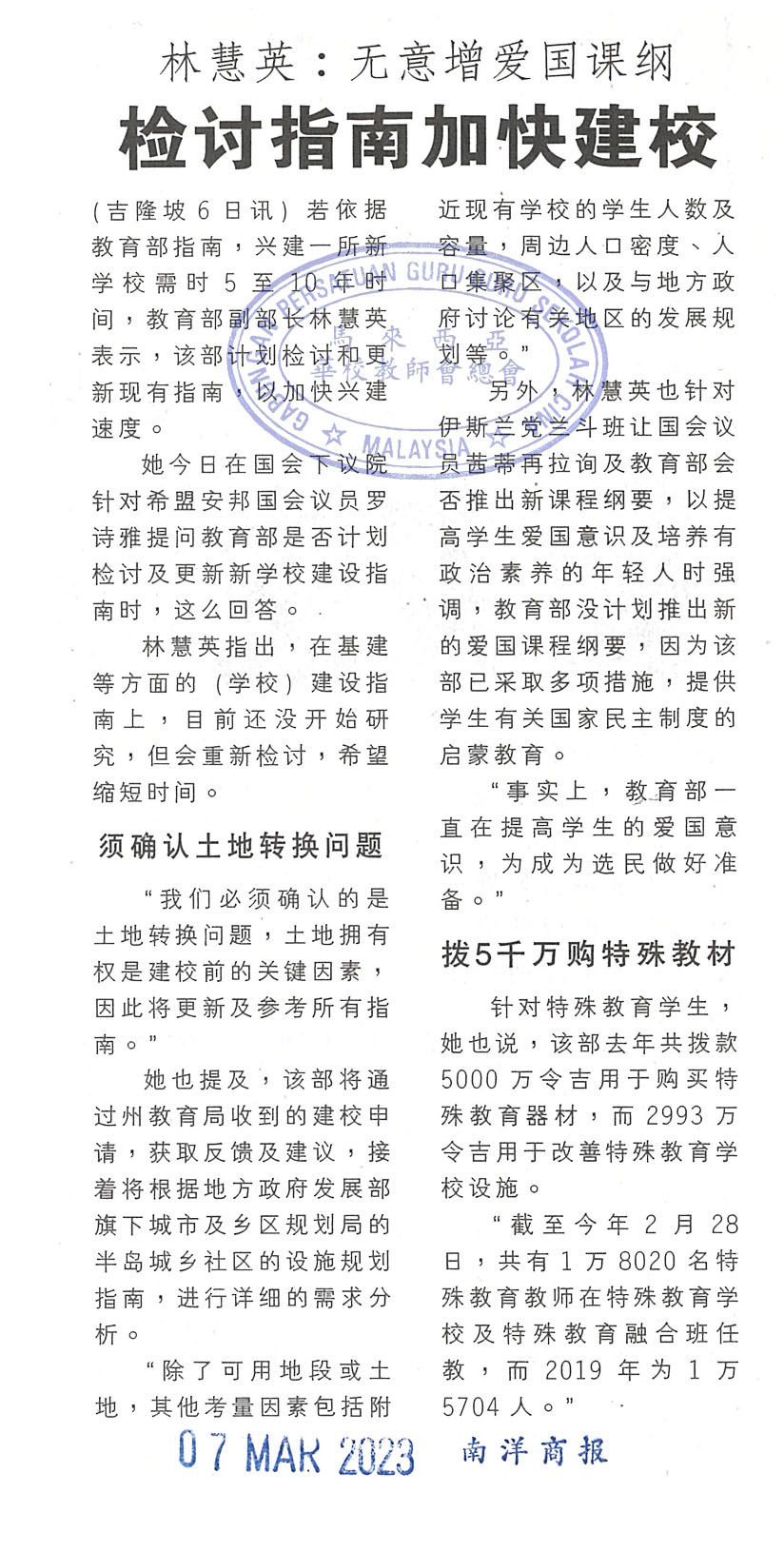 林慧英:无意增爱国课纲 检讨指南加快建校 WhatsApp 上一篇文章: 非巫裔能否任相?慕克力:须废多源流学校 林吉祥:宪法岂有这规定 上一页 下一篇文章: 谈学校水费暴涨课题 副教长将会环境部长 下一页