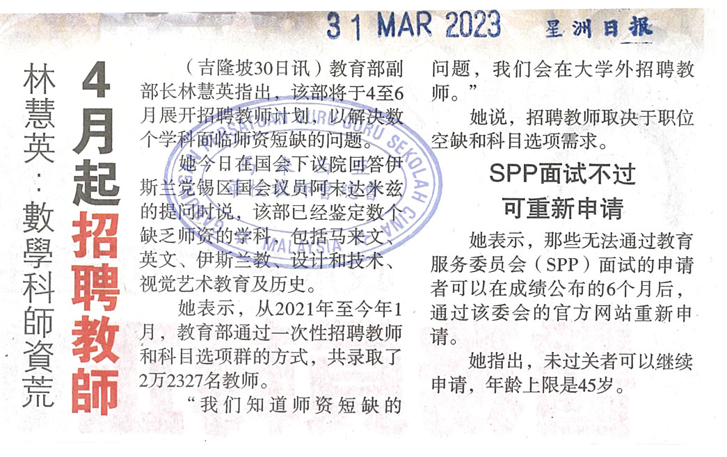 林慧英:数学科师资荒 4月起招聘教师