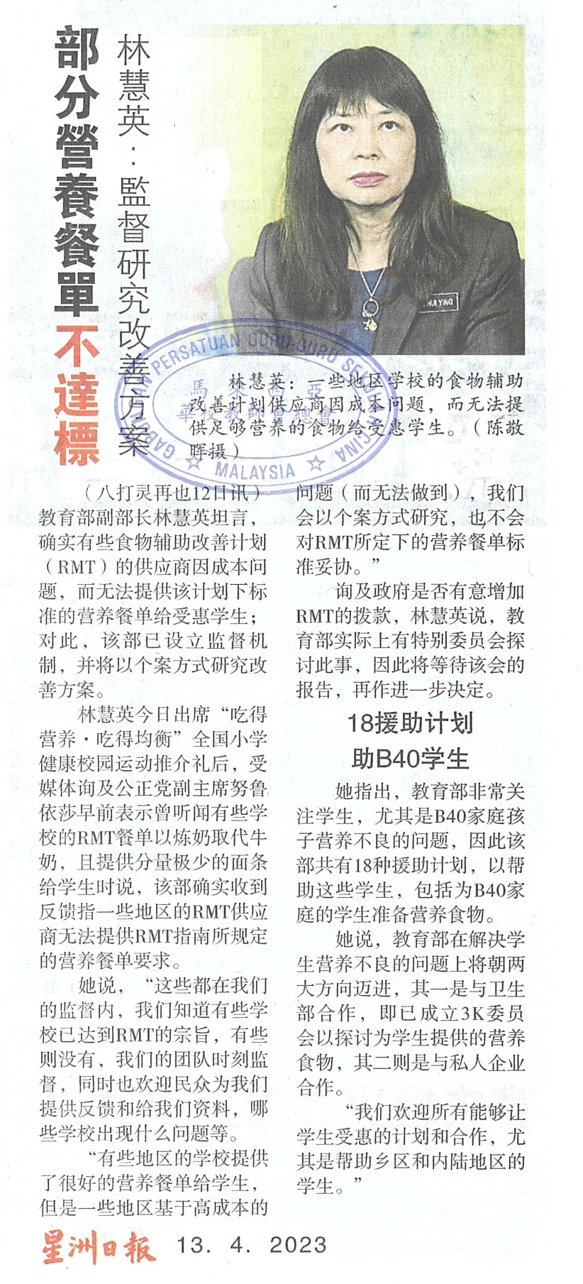 林慧英:部分营养餐单不达标 监督研究改善方案