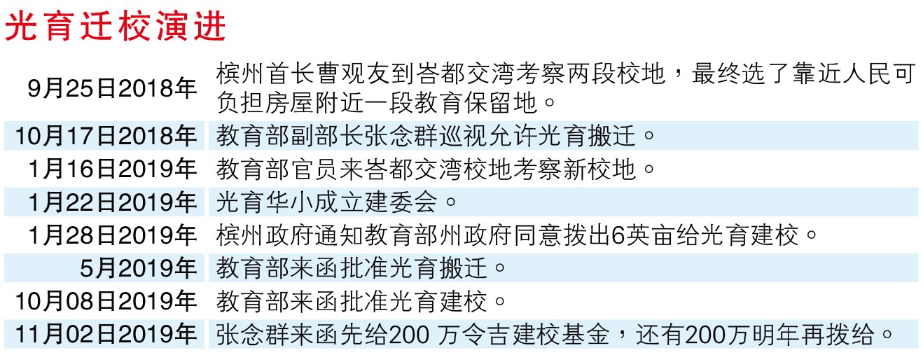 当年光育已在筹谋迁校,新校地已有着落,副教育部长也答应拨款200万令吉,校长希望黄伟彰能担任建委会主席,但他婉拒了。