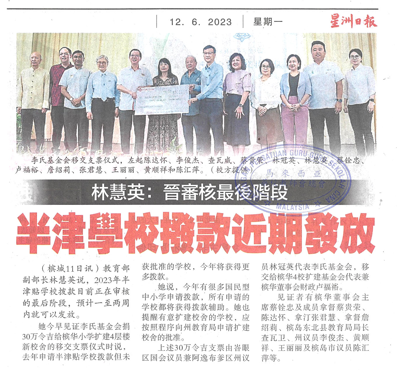 林慧英:晋审核最后阶段 半津学校拨款近期发放