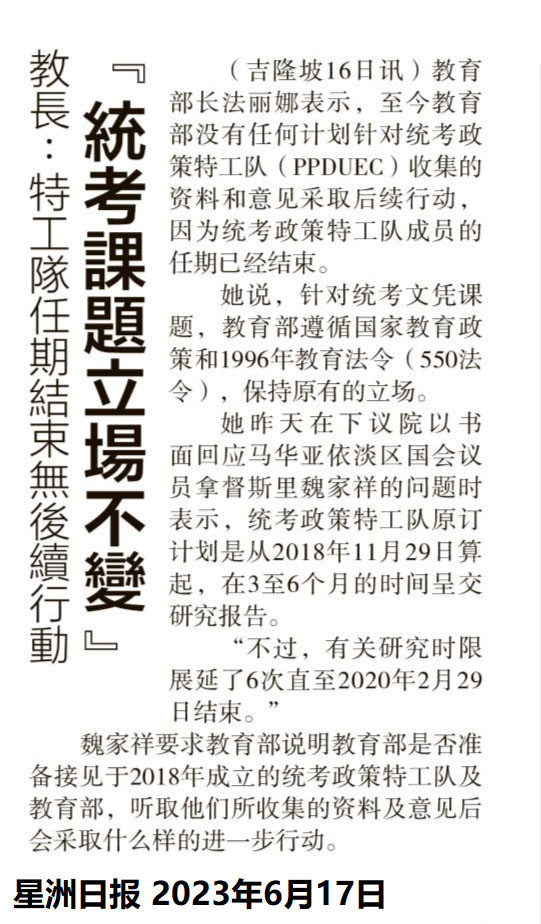 教长:特工队任期结束无后续行动 统考课题立场不变