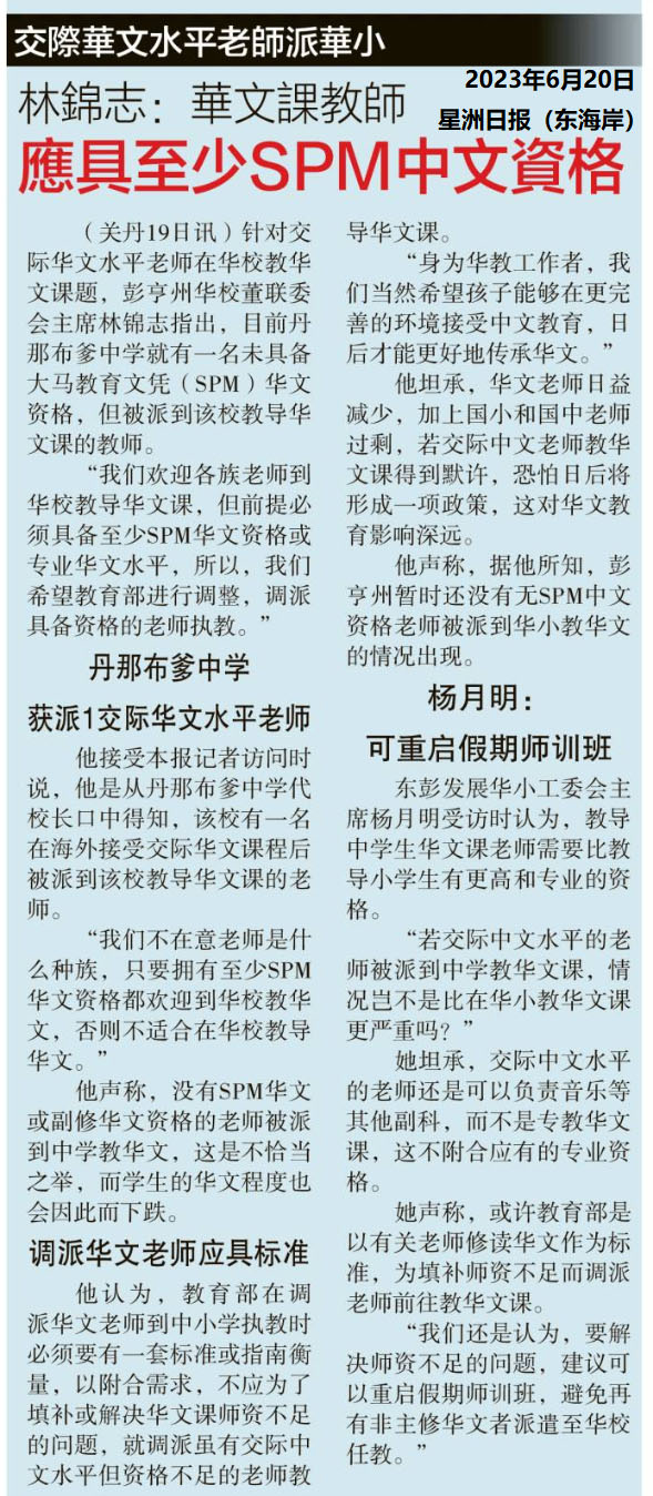 林锦志:华文课教师 应具至少SPM中文资格