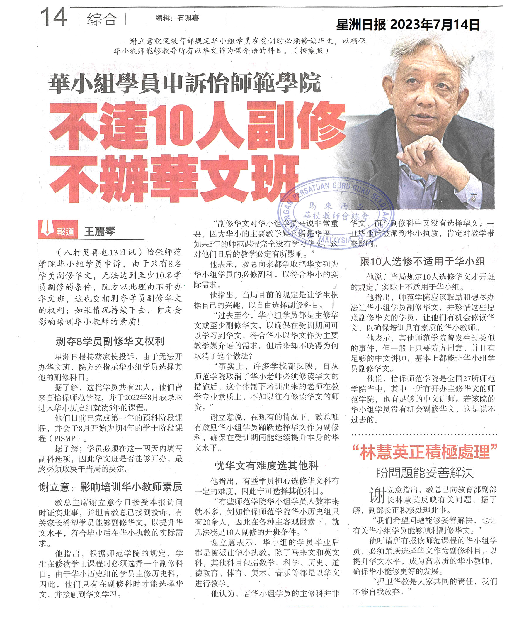 华小组学员申诉怡师范学院 不达10人副修不办华文班