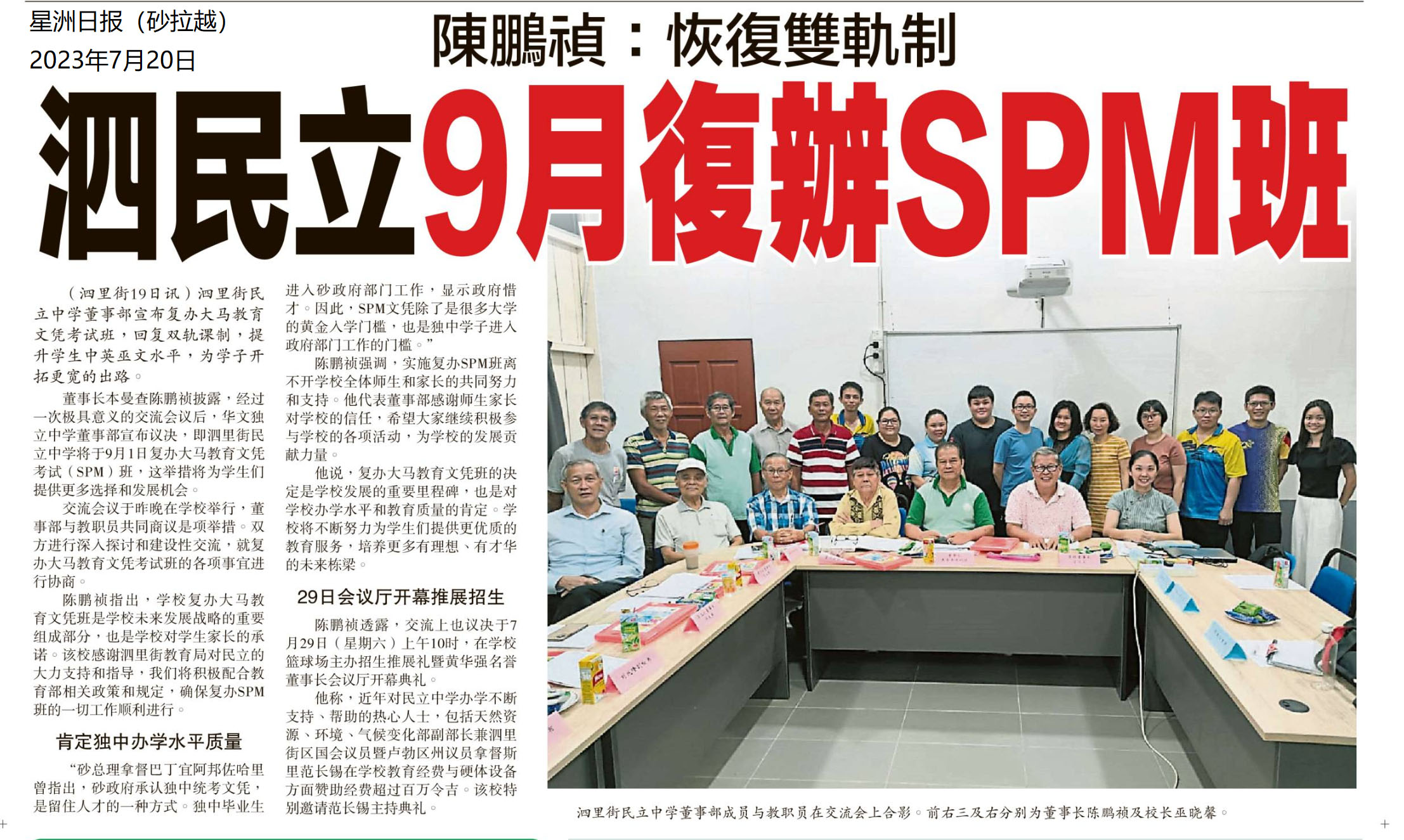 陈鹏祯:恢复双轨制 泗民立9月复办SPM班
