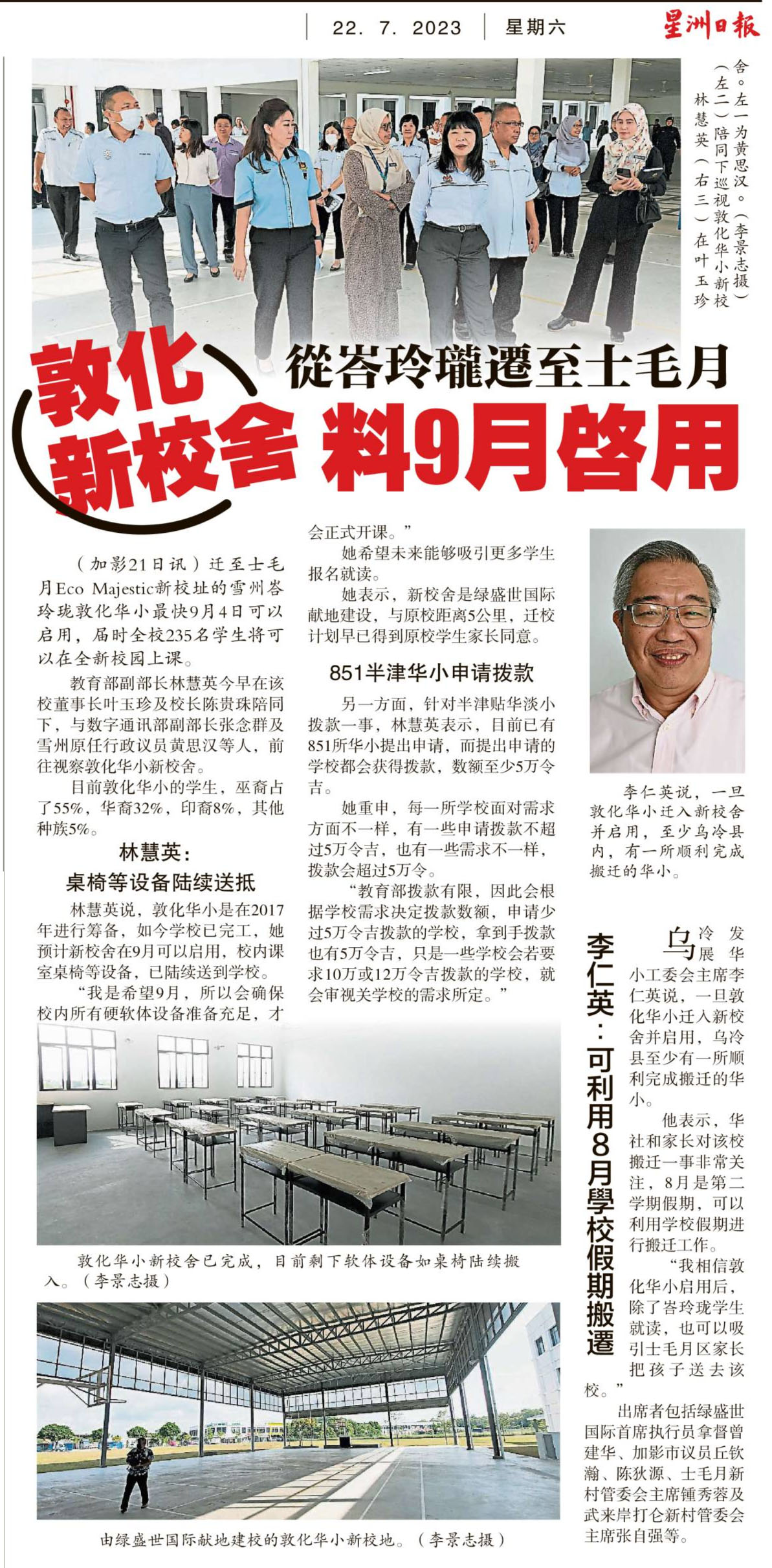 敦化新校舍 从峇玲珑迁至士毛月 料9月启用