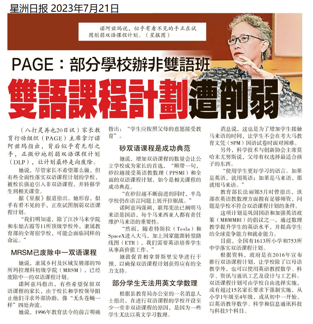 PAGE:部分学校办非双语班 双语课程计划遭削弱 WhatsApp 上一篇文章: 教长:学生无需向教育部申请 校长可直接录取读中六 上一页 下一篇文章: 敦化新校舍 从峇玲珑迁至士毛月 料9月启用 下一页