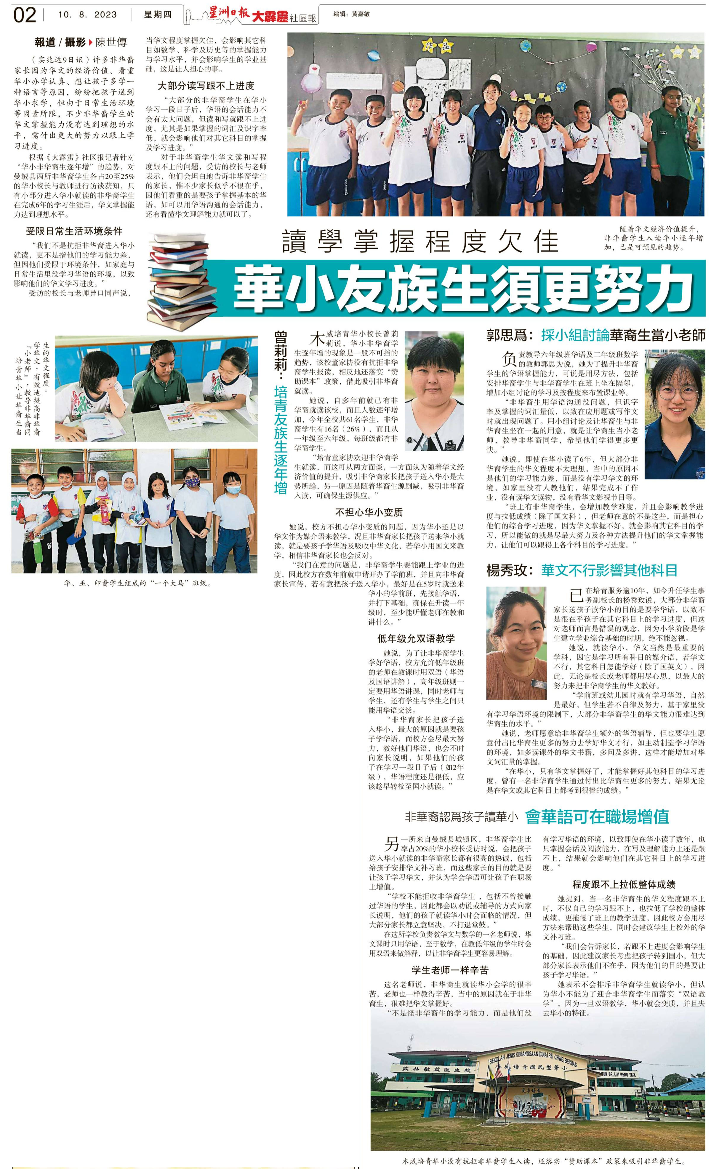 读写掌握程度欠佳 华小友族生须更努力