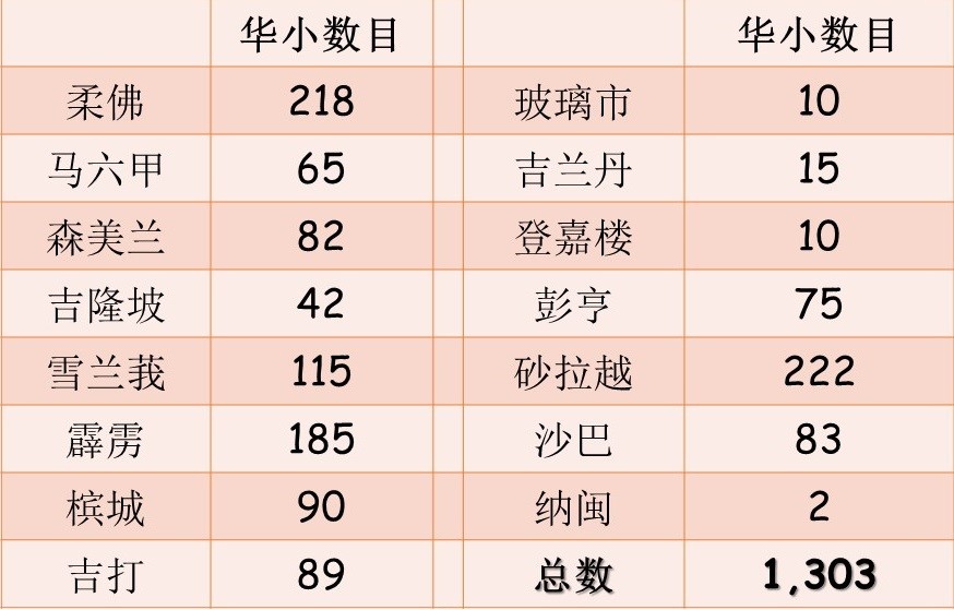 全国目前一共有1303所华小,分布如下:
