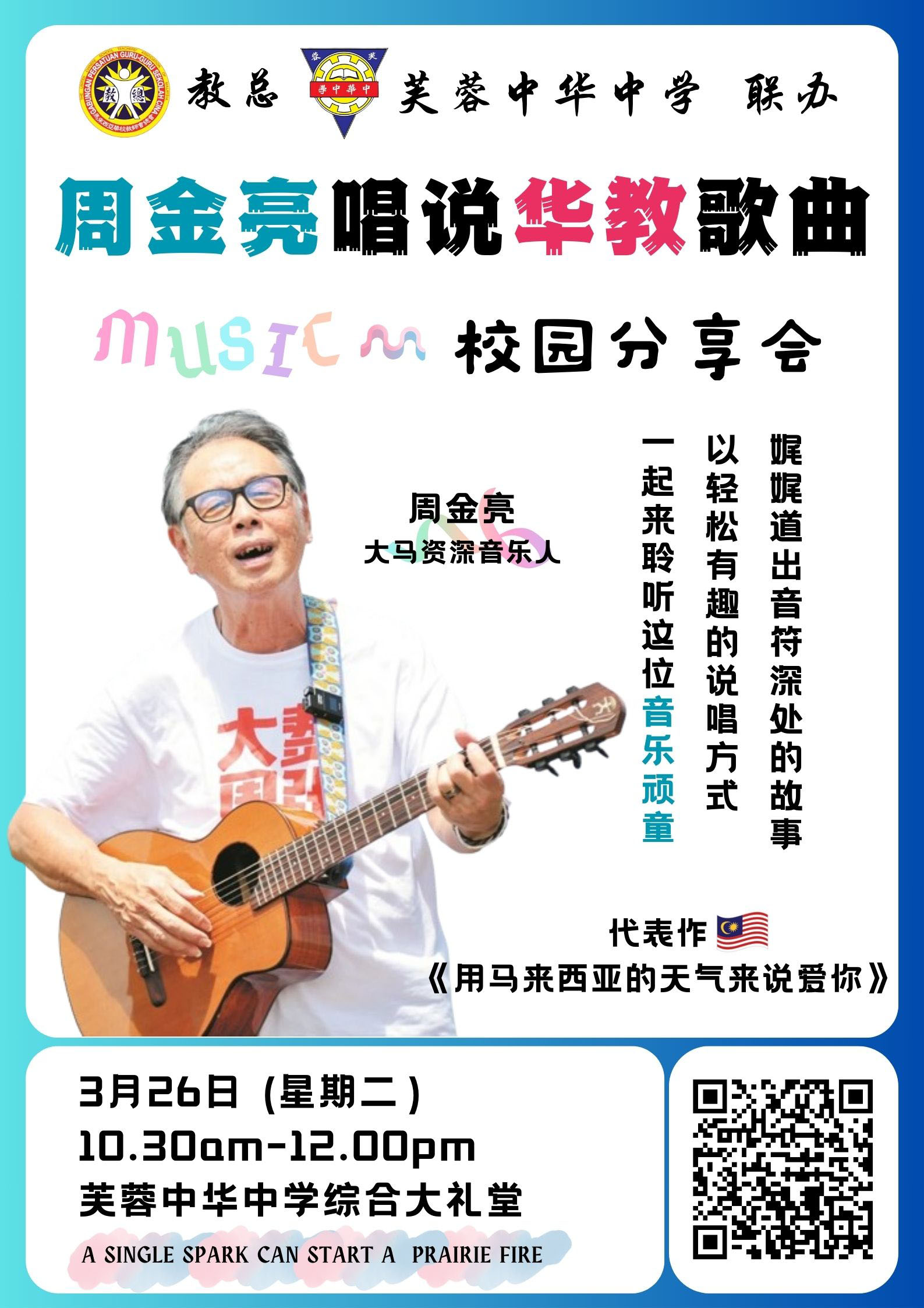在分享会上,周金亮老师将以说唱的方式演绎多首华教歌曲,并和学生分享他创作这些歌曲的心路历程,以及讲述当中的华教故事。