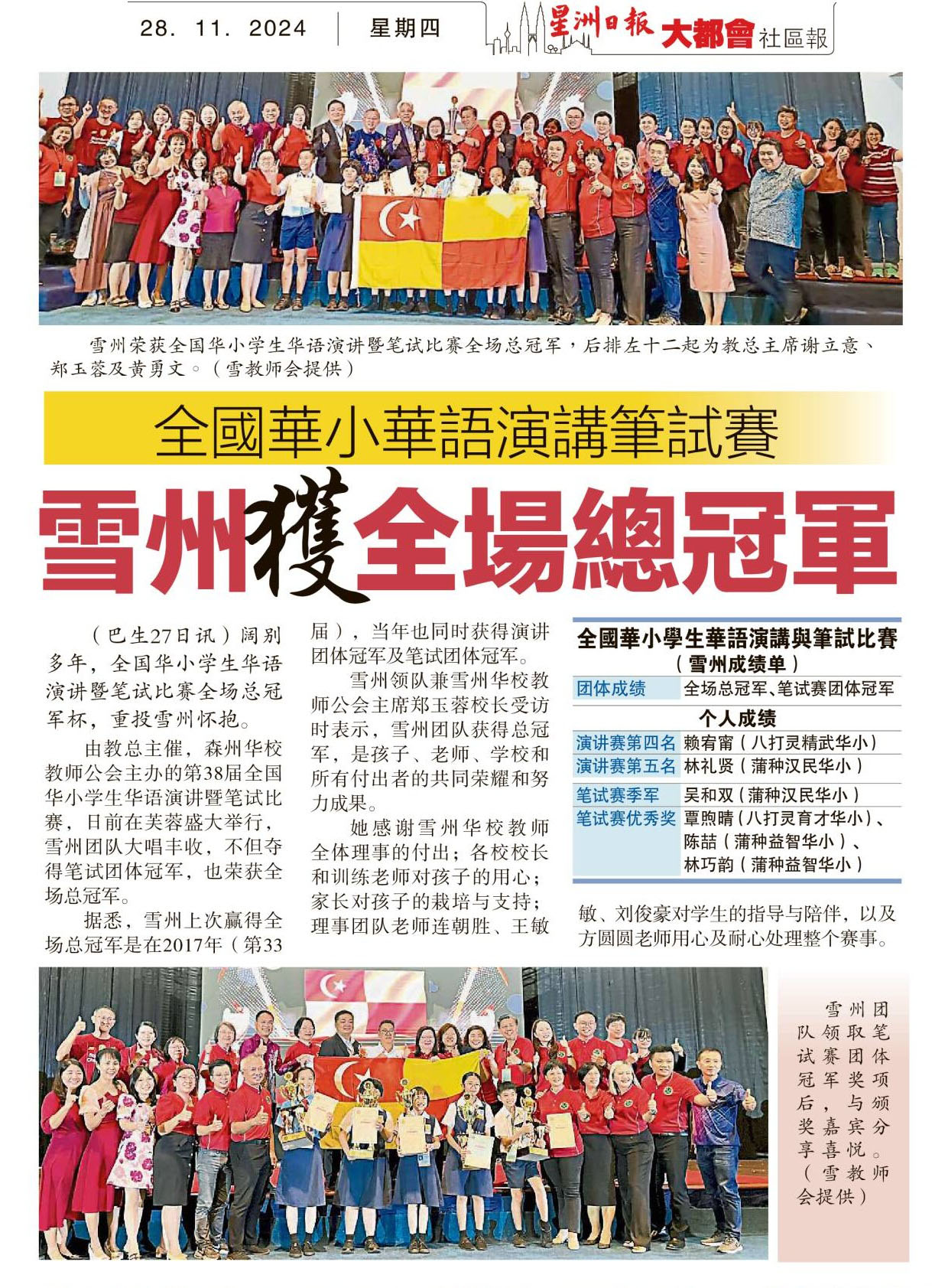 全国华小华语演讲笔试赛 雪州获全场总冠军 WhatsApp 上一篇文章: 胸怀少年志 四海一家亲|2024年中外“少年长安行”活动圆满举行 上一页 下一篇文章: 华小华语演讲暨笔试赛 雪夺总冠军 下一页