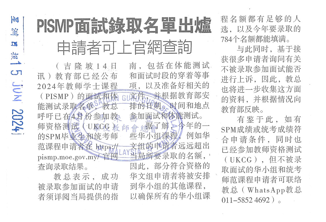 PISMP面试录取名单出炉 申请者可上网查询 WhatsApp 上一篇文章: 教总呼吁师范课程华小组申请者依安排出席面试和体能测试 上一页 下一篇文章: 若784华小组名额未填满 教总建议师训次轮招生 下一页
