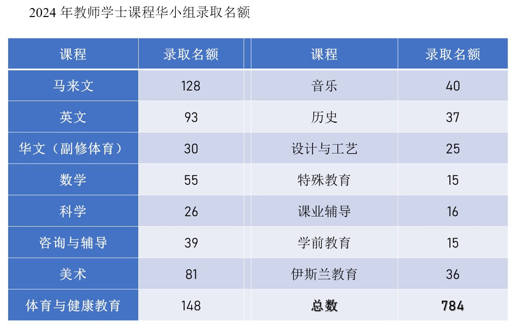 今年的教师学士课程华小组的录取名额有784个,而申请者则有4063人。教总表示,只有符合当局所定下的基本条件,并通过教师资格测试的申请者,才会被录取参加面试和体能测试环节,以获得进入师范学院受训的机会。因此,教总呼吁成功被录取的申请者把握机会,踊跃出席面试。