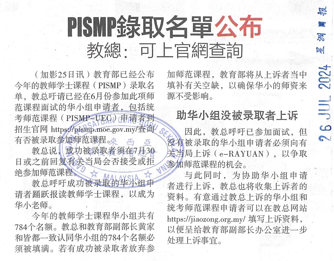 PISMP录取名单公布 教总:可上官网查询 WhatsApp 上一篇文章: 教育部大学毕业生教育文凭课程(PDPP)招生,截止日期8月19日 上一页 下一篇文章: 2024年教师学士课程上诉(已经参加面试) 下一页