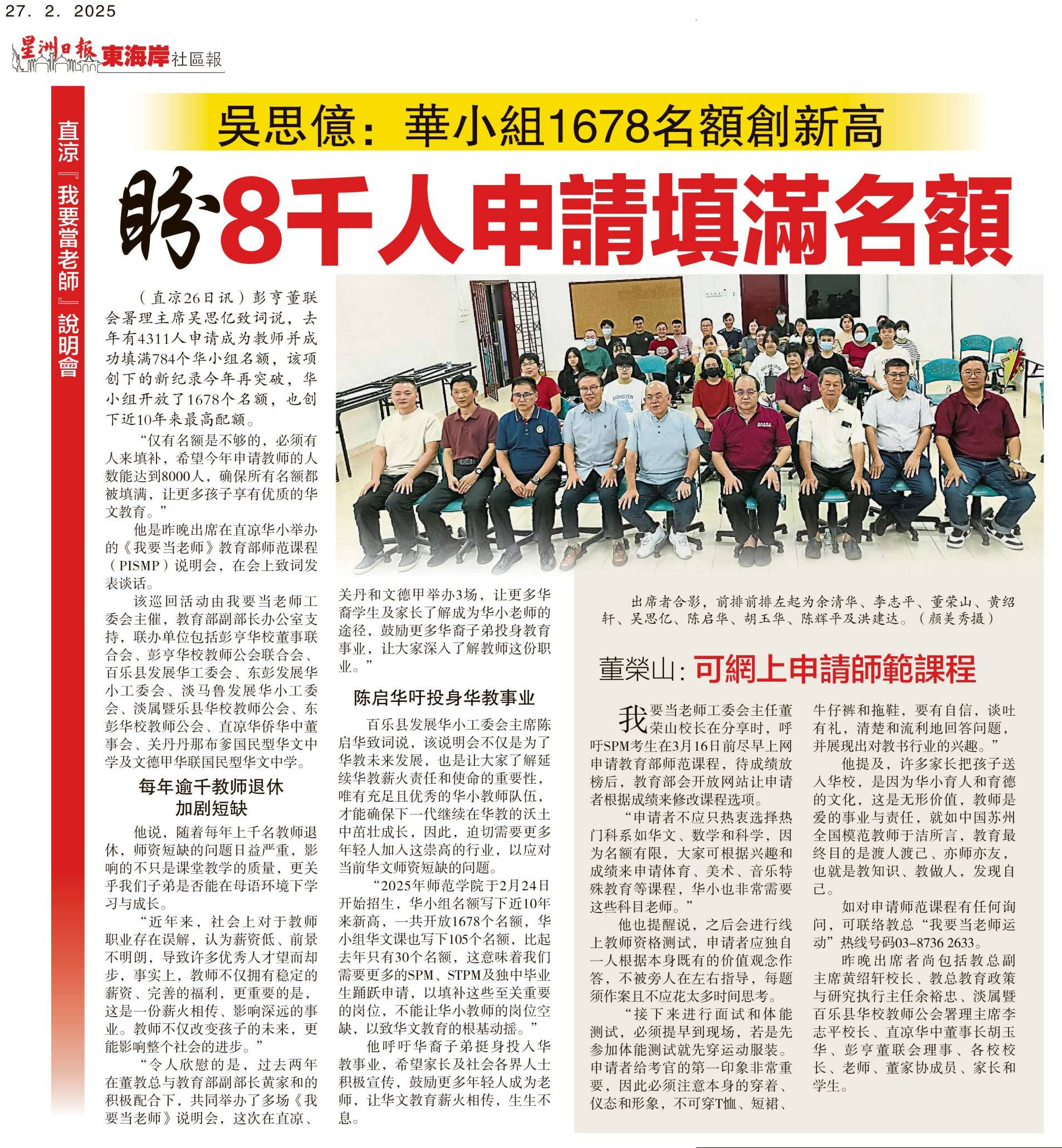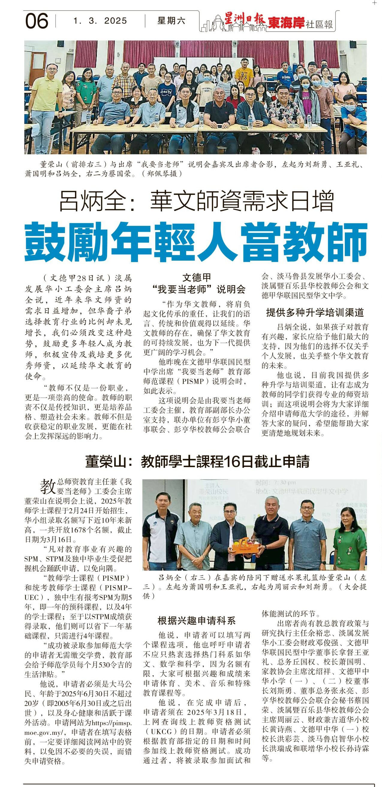 我要当老师巡回说明会(彭亨)新闻剪报 WhatsApp 上一篇文章: 我要当老师巡回说明会(柔佛)新闻剪报 上一页 下一篇文章: 欢迎大家协助广传 / 2025 PISMP 招生 2月24日至3 月16 日 下一页