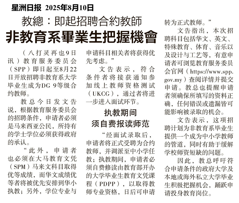 教总:即起招聘合约教师 非教育系毕业生把握机会 WhatsApp 上一篇文章: 教育部展开 PDPP 招生:非教育系毕业生可申请成为小学教师 上一页 下一篇文章: 率先推“我要当老师”运动 昔华教发展工委会奖励8人 下一页