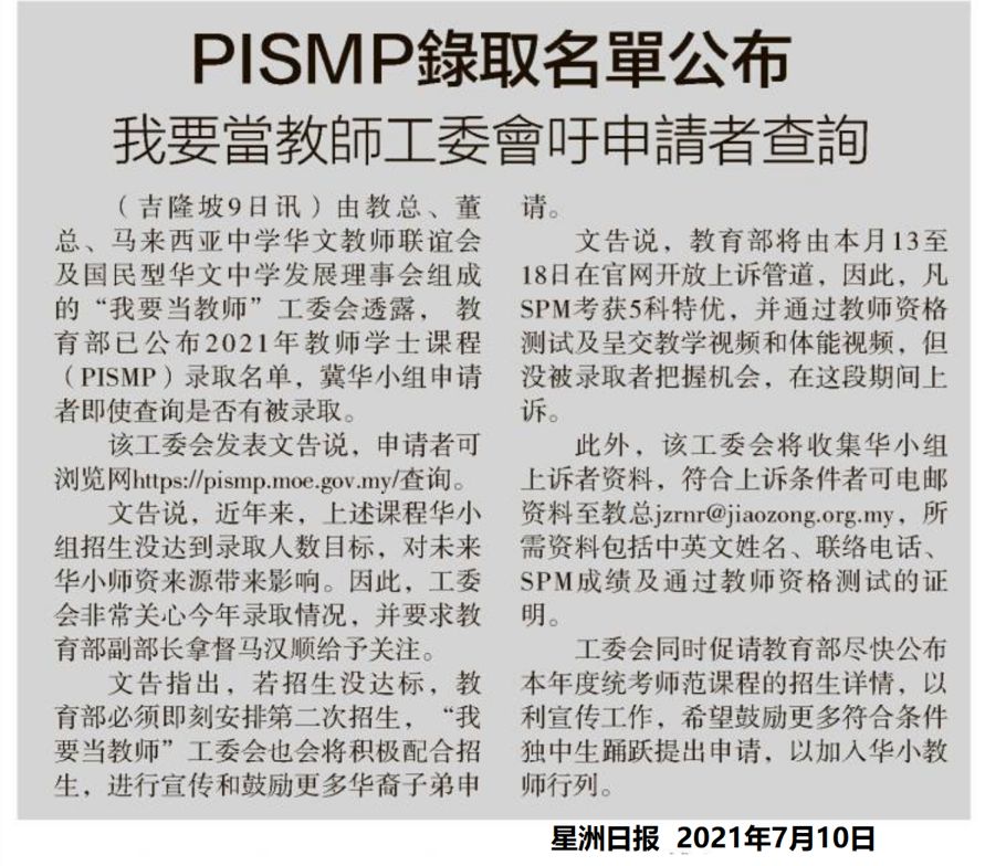 PISMP录取名单公布 我要当教师工委会吁申请者查询 WhatsApp 上一篇文章: 欢迎广传2021年统考教师学士课程(PISMP-UEC)的招生 上一页 下一篇文章: 统考生 华小师资生力军 下一页