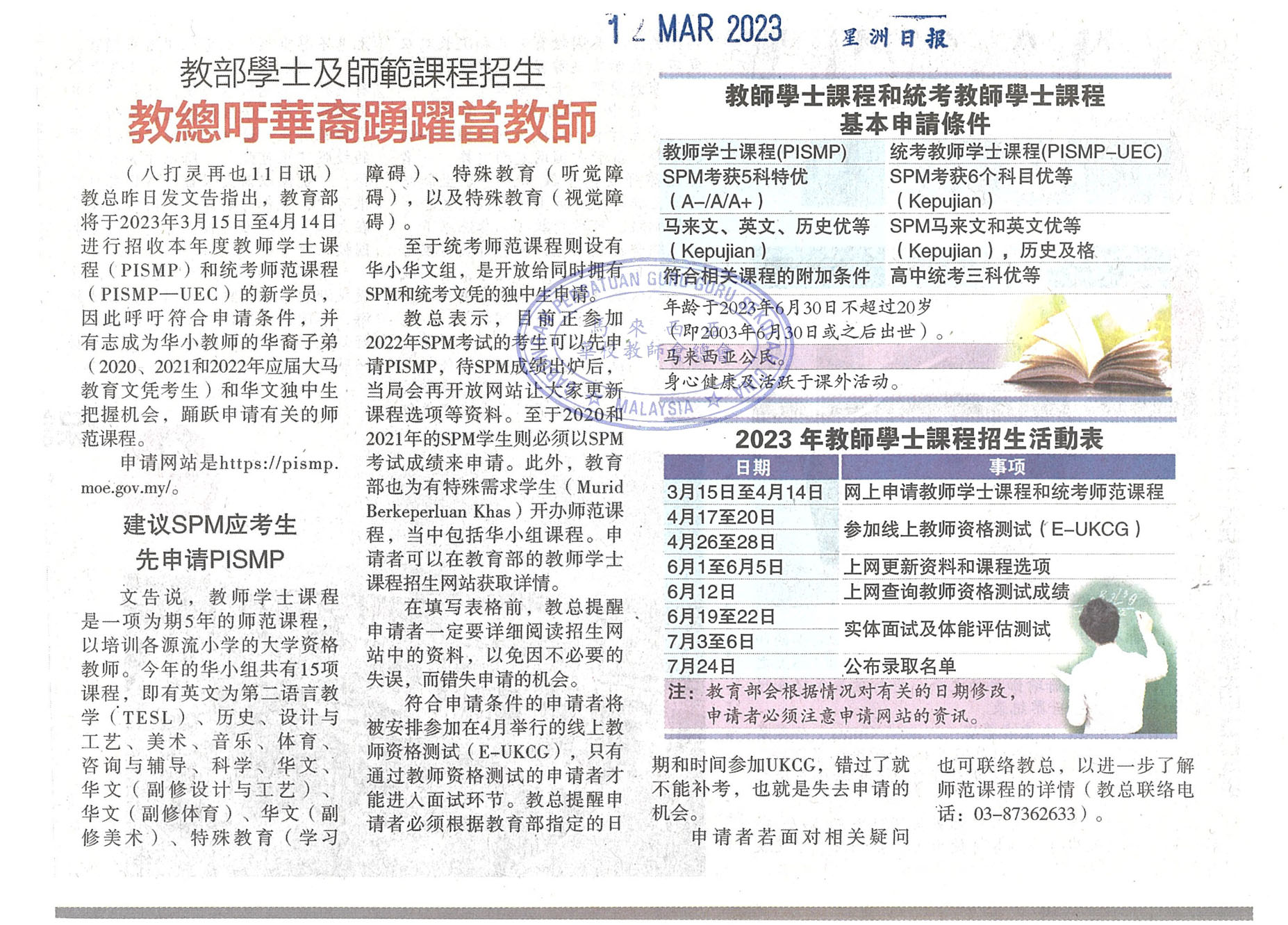 教育部师范课程招生 教总吁华裔踊跃当教师
