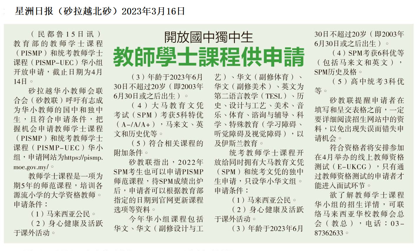 开放国中独中生 教师学士课程供申请