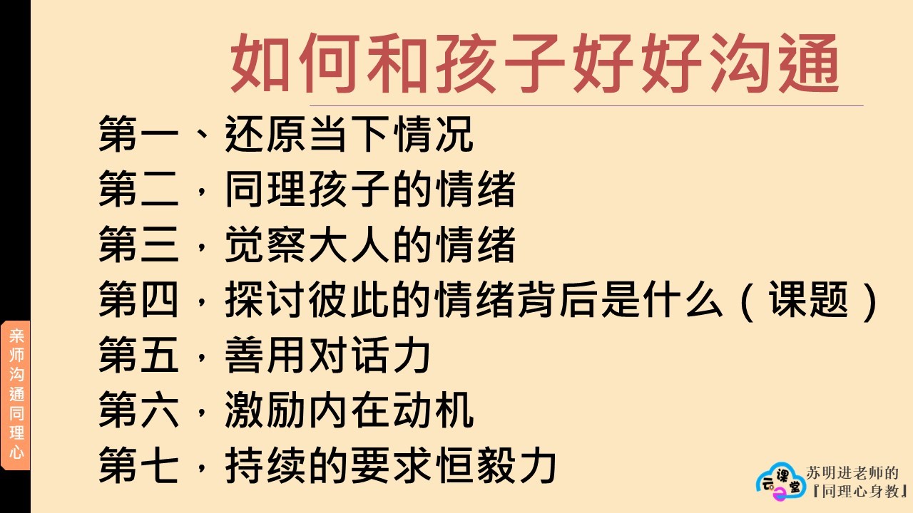苏老师提供大家“同理心五步骤”:一、觉察自身的情绪,二、同理他人的情绪,三、同理他人的认知,四、同理他人的需求,五、化为具体行动。