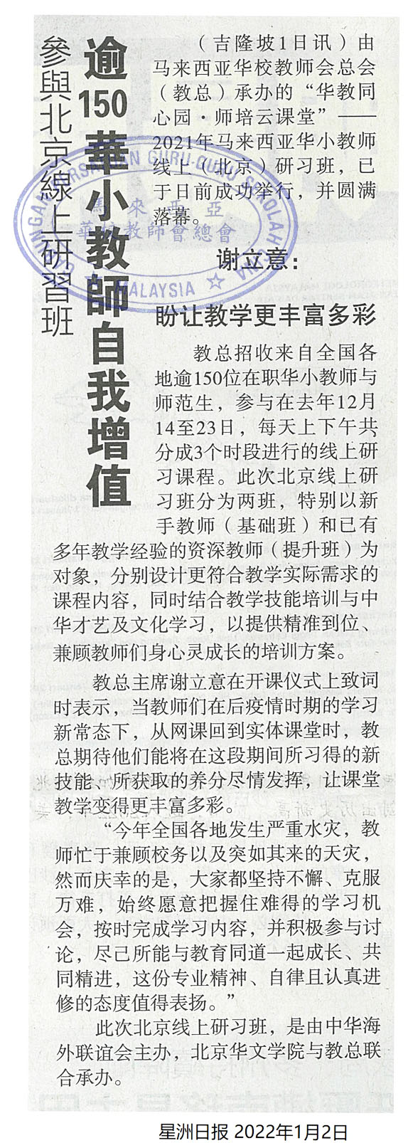 参与北京线上研习班 逾150华小教师自我增值 WhatsApp 上一篇文章: 教总线上研习班 100教师师范生参与 上一页 下一篇文章: 2021年海外华文教师研修班(福州)教学理论技能与中华文化才艺【高级班】 下一页