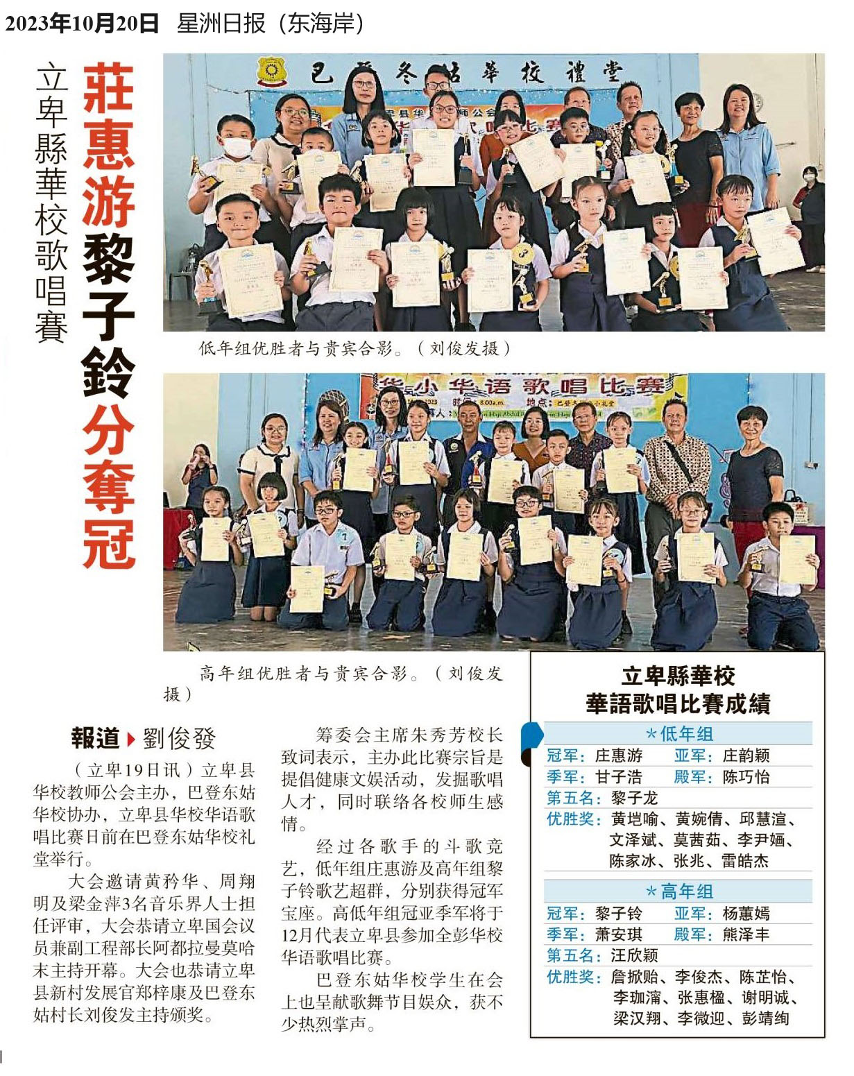 立卑县华校歌唱赛 庄惠游黎子玲分夺冠