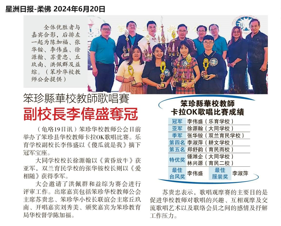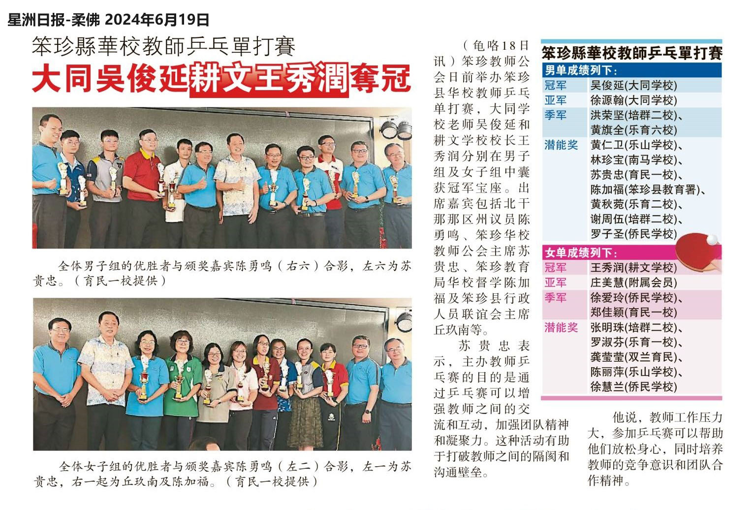 笨珍县华校教师乒乓单打赛 大同吴俊延 耕文王秀润夺冠