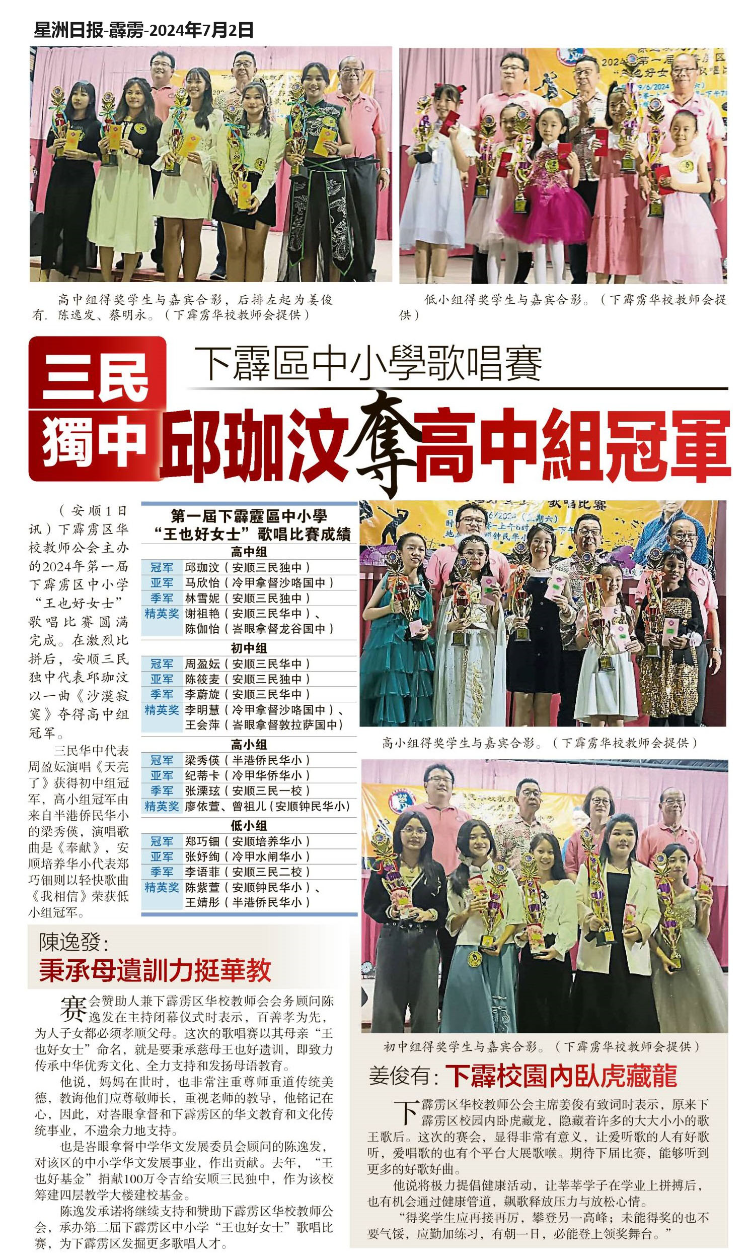下霹雳区中小学歌唱赛 三民独中邱珈汶夺高中组冠军