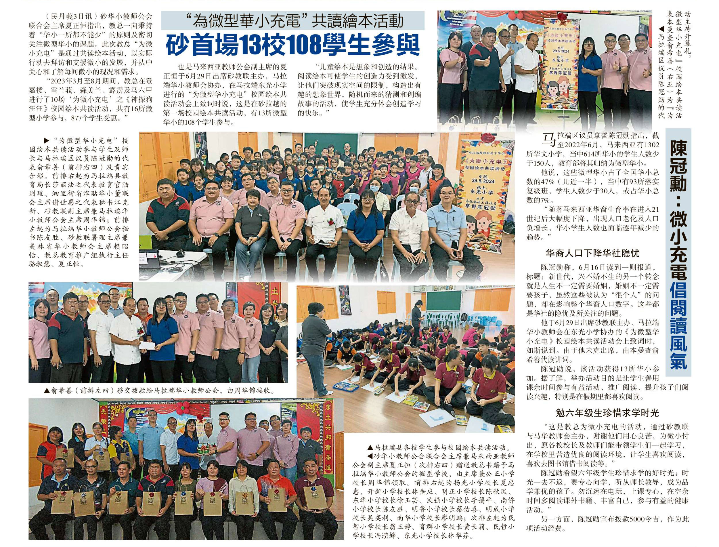 教总于6月29日在砂拉越马拉端东光小学为13所微型华小举办“教总为微小充电”《神探狗汪汪》校园绘本共读活动,以让学生能通过有趣的共读活动,感受到绘本阅读的乐趣,共有108位学生受惠。