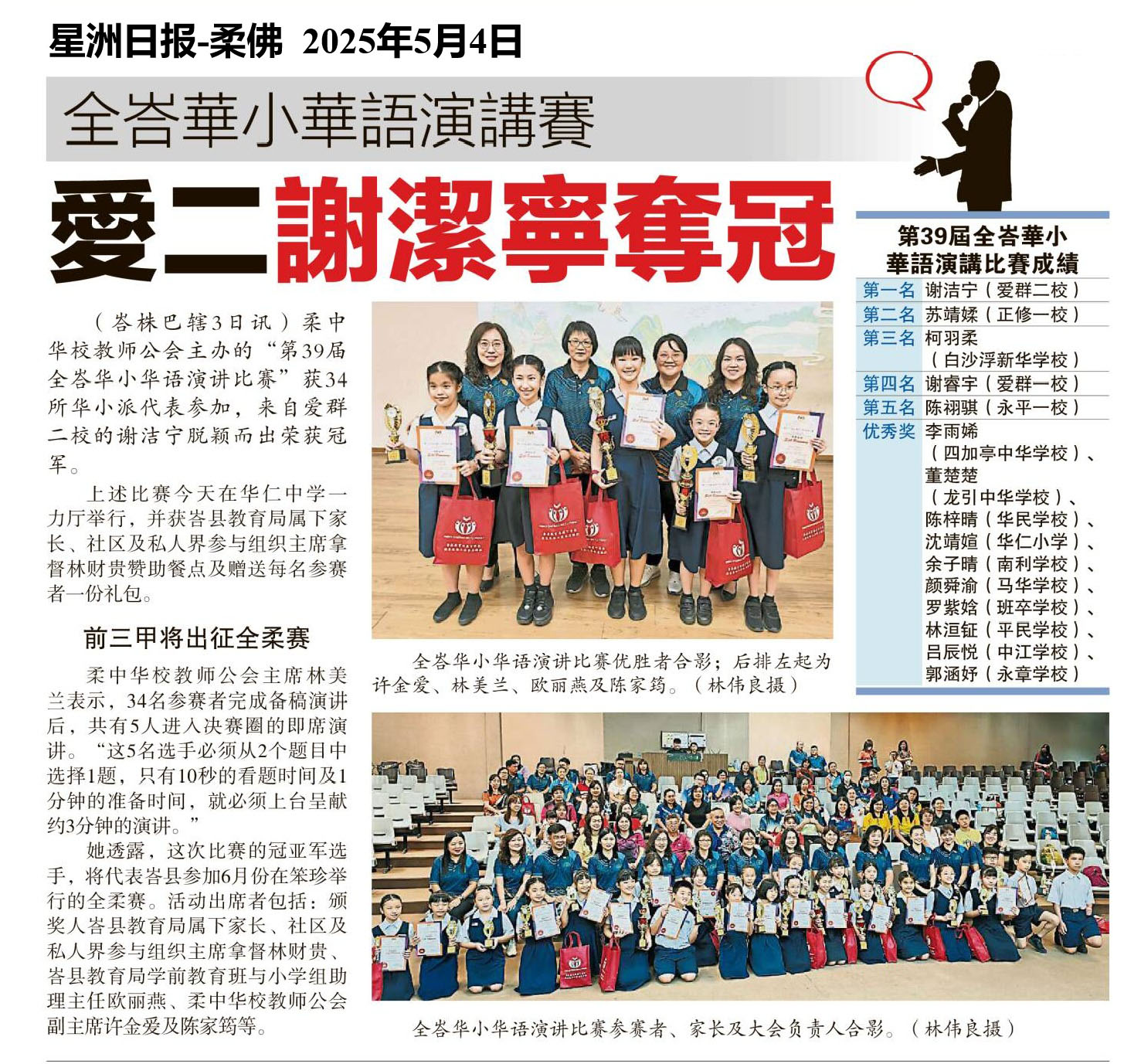 全峇华小华语演讲赛 爱二谢洁宁夺冠