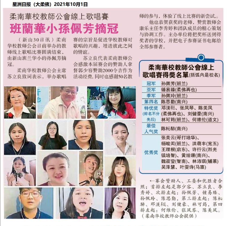 柔南华校教师公会线上歌唱赛 班兰华小孙佩芳摘冠 WhatsApp 上一篇文章: 文冬华校教师公会 捐加叻8师生各1600 上一页 下一篇文章: 甲华校教师公会办培训课程 310教师参与专案式教学 下一页