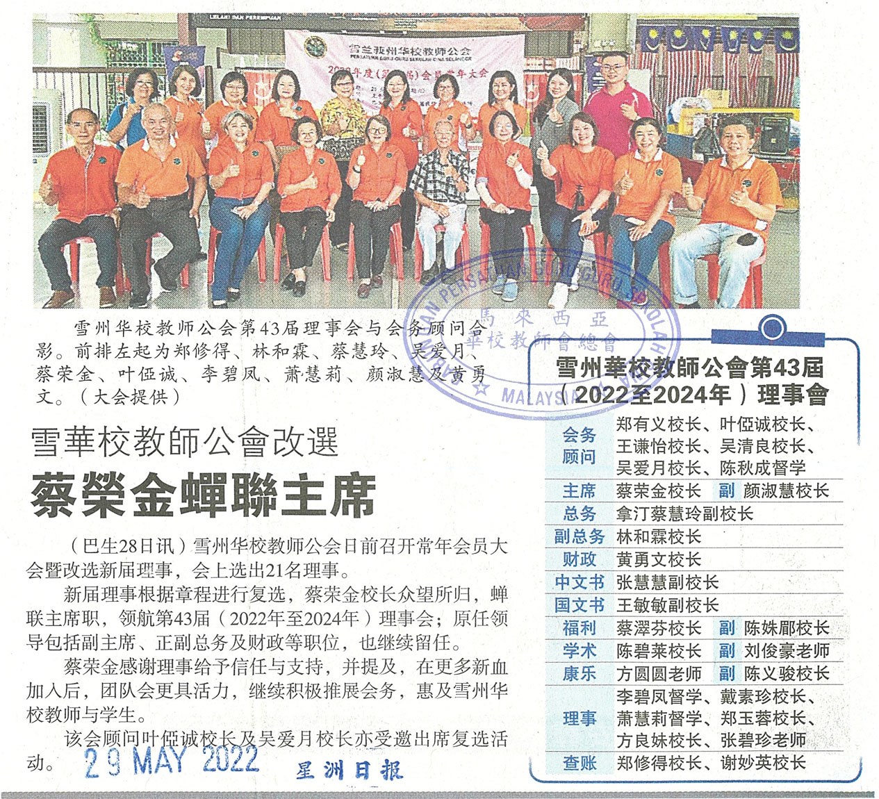 雪华校教师公会改选 蔡荣金蝉联主席