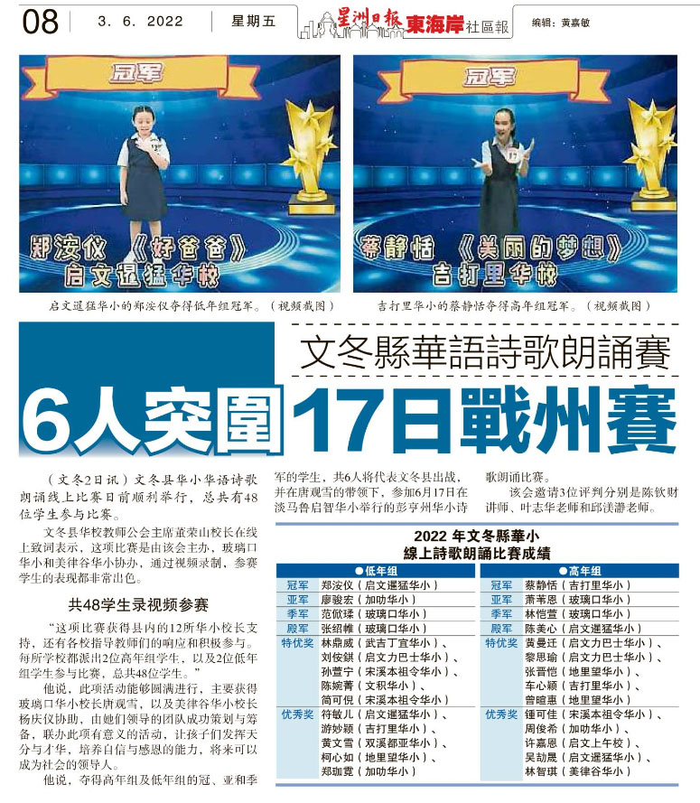文冬县华语诗歌朗诵赛 6人突围17日战州赛