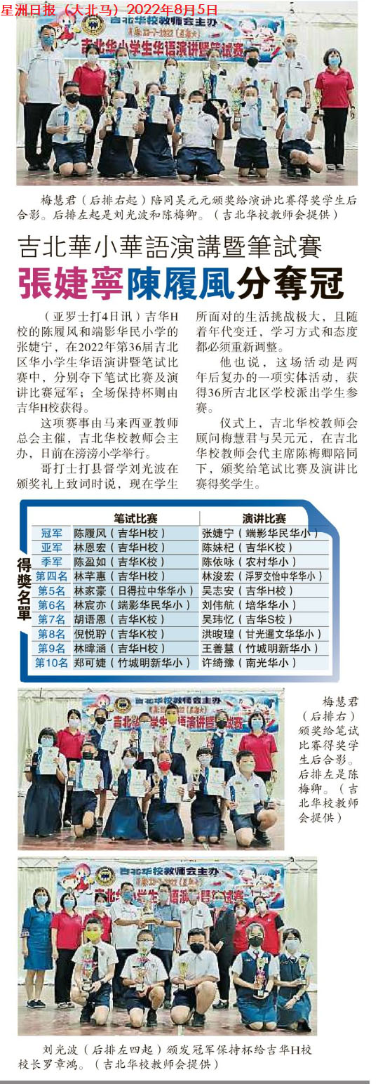 吉北华小华语演讲暨笔试赛 张婕宁 陈履风分夺冠 WhatsApp 上一篇文章: 全国华小华语演讲初赛 甲区100人13日比拼 上一页 下一篇文章: 沙巴教总大会通过六项提案 坚决反对关闭或合并微型华小 下一页