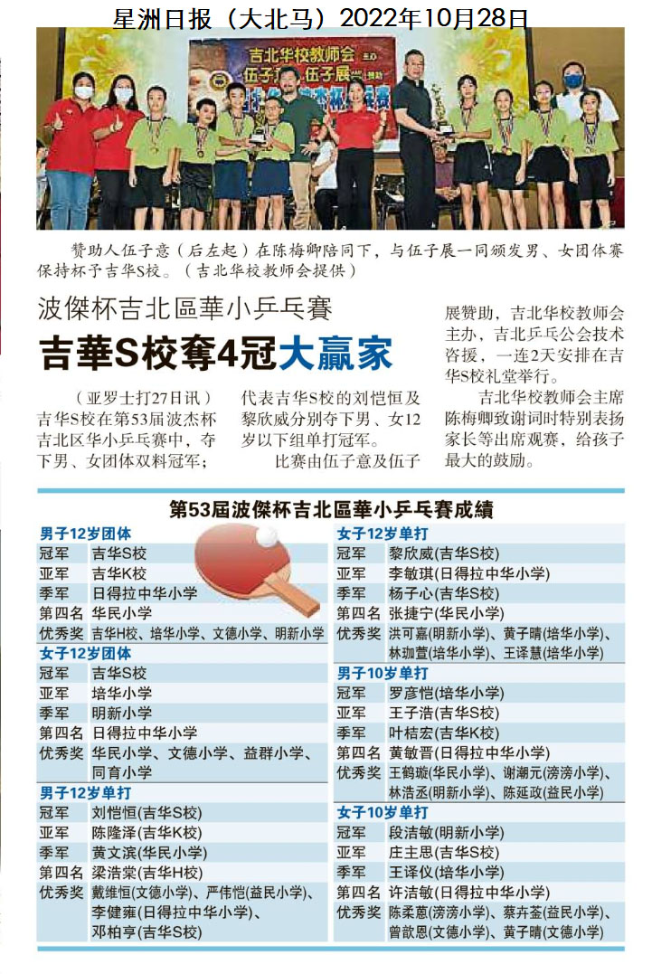 波杰杯吉北区华小兵乓赛 吉华S校夺4冠大赢家