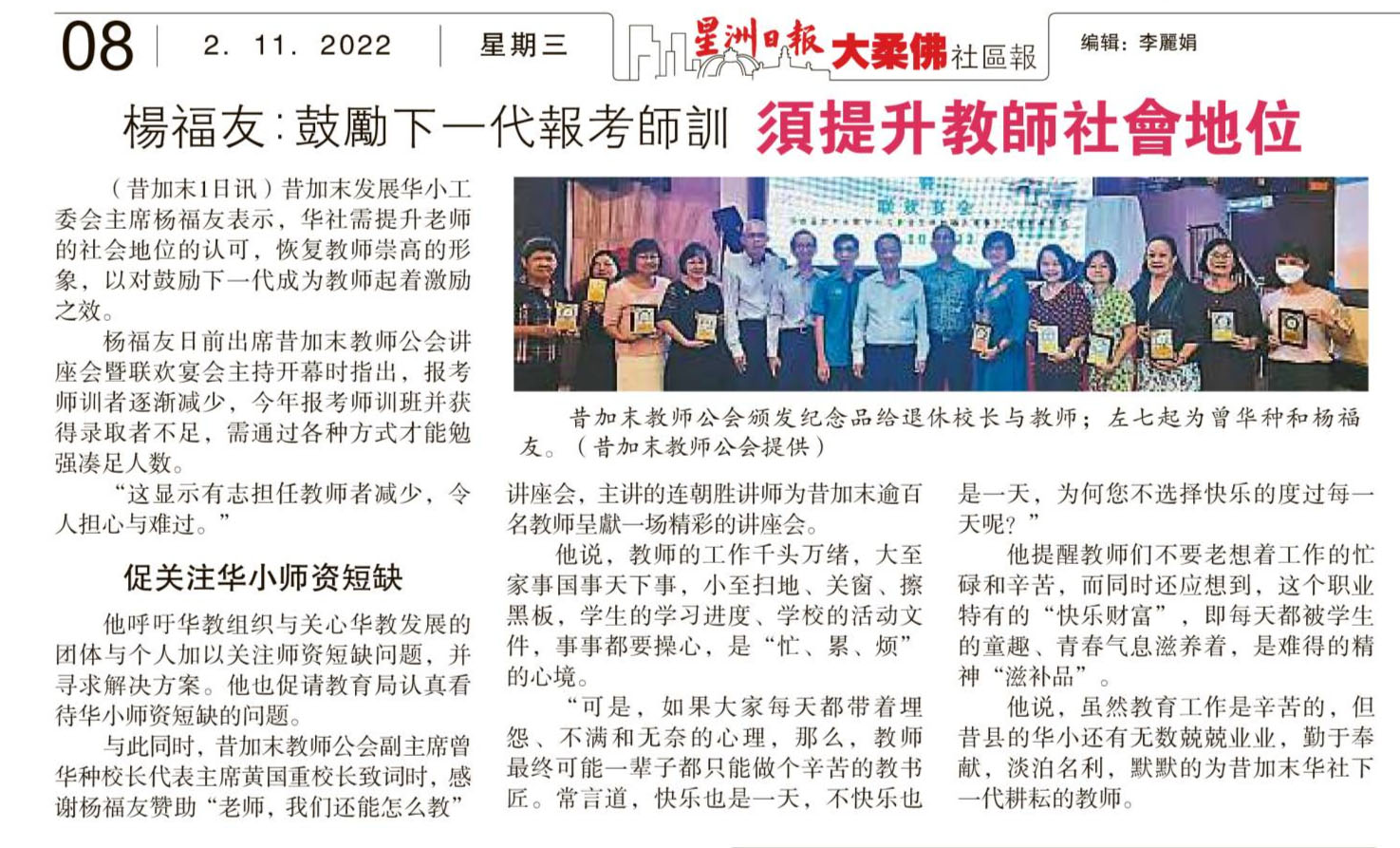 杨福友:鼓励下一代报考师训 须提升教师社会地位 WhatsApp 上一篇文章: 老师“压力山大”怎办?宋慧慈线上分享 教师学习解压 上一页 下一篇文章: 波杰杯吉北区华小兵乓赛 吉华S校夺4冠大赢家 下一页