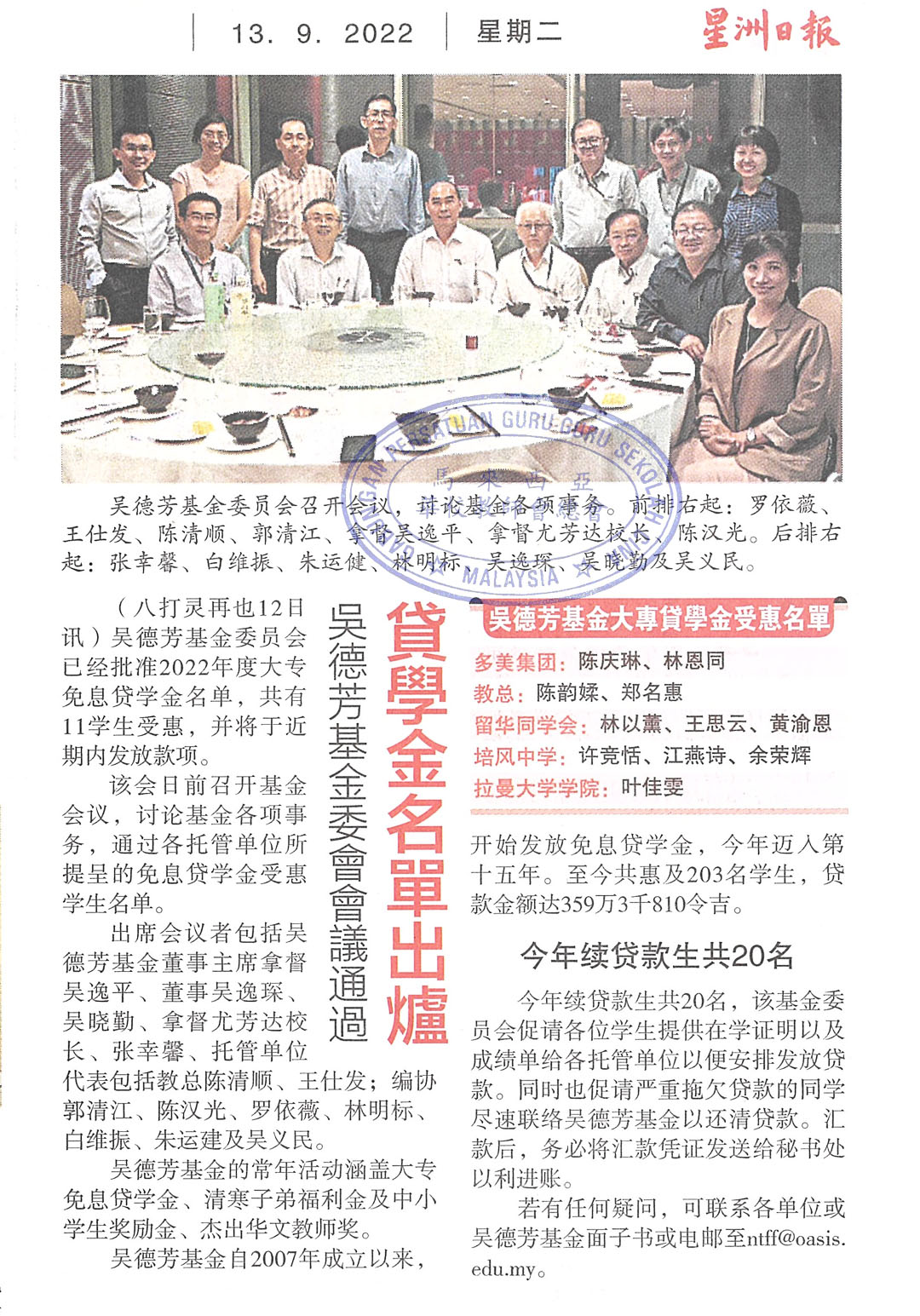 吴德芳基金委会会议通过 贷学金名单出炉