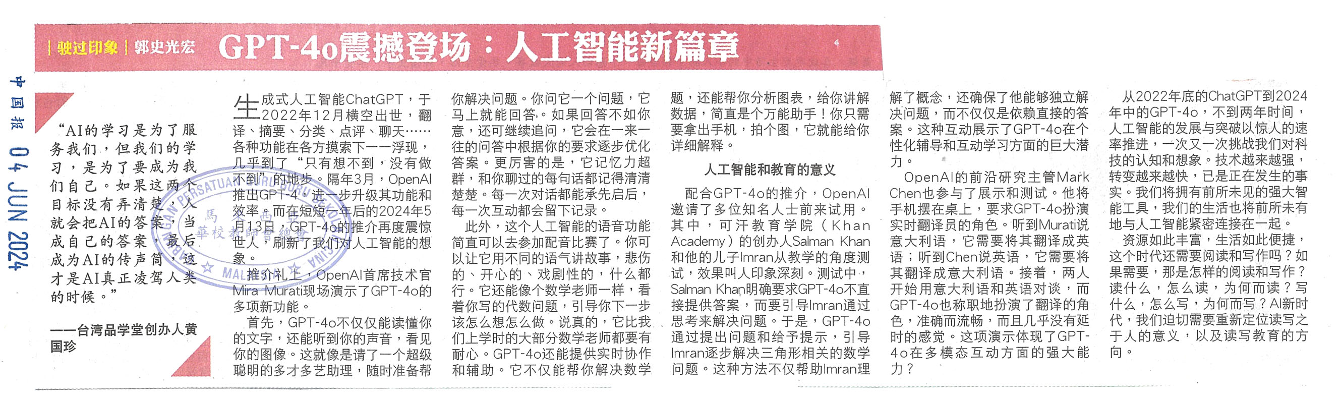 郭史光宏 / GPT-4o震撼登场:人工智能新篇章 WhatsApp 上一篇文章: 想修读中文相关科系该往何处去? 上一页 下一篇文章: 食堂置钢琴 鼓励展才华 加影育华校长深信爱音乐孩子不会学坏 下一页