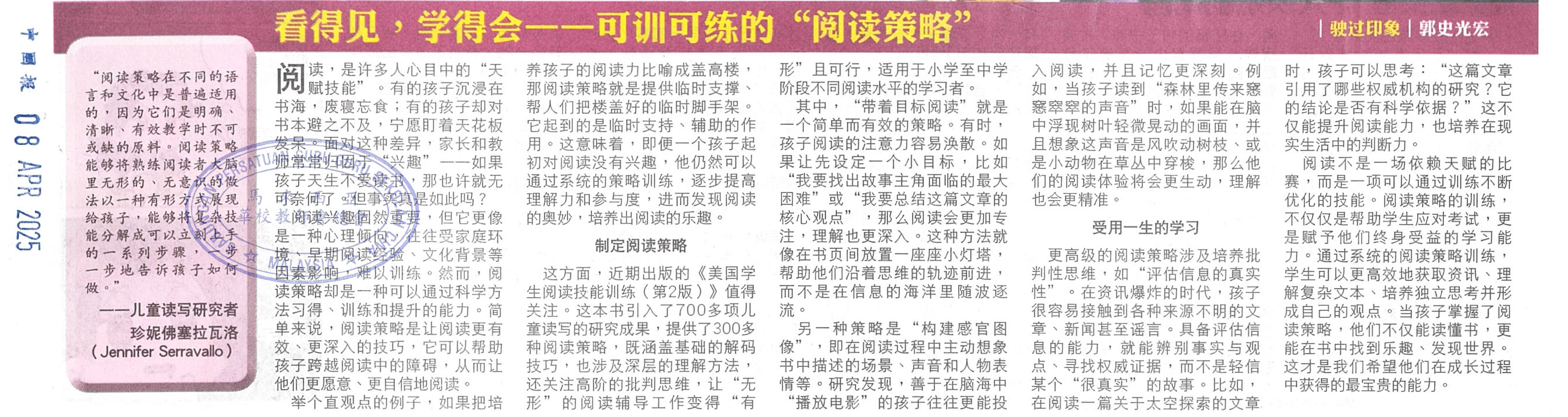 郭史光宏 / 看得见,学得会 ——可训可练的“阅读策略” WhatsApp 上一篇文章: 9岁抱怨话 轮到儿子讲 马来4姐妹念华小翱翔 上一页 下一篇文章: 打造北马首间电脑科学综合教学室 麦小走在科技前端 下一页