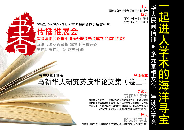 由雪隆海南会馆青年团乐圣岭读书会主办、教总《孩子》双月刊和董总《中学生》月刊协办的“一起进入学术的海洋寻宝——华人民间信仰·多元草根文化”导读分享会将于2010年4月18日早上9时至中午1时,在雪隆海南会馆天后宫礼堂进行。