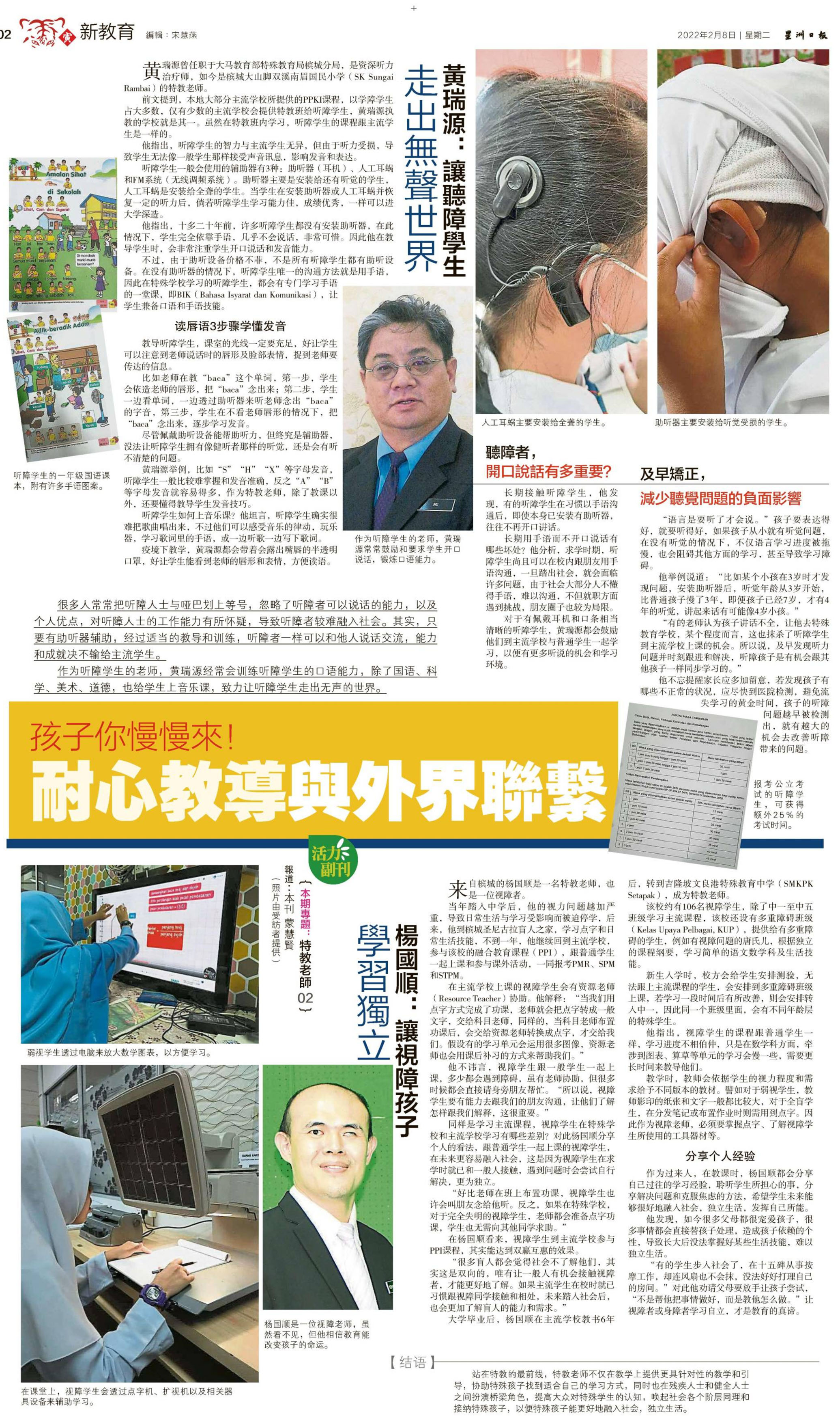 《星洲日报》新教育专题:特教老师02 孩子你慢慢来!耐心教导与外界联系 WhatsApp 上一篇文章: 郭史光宏:要有高素质教育,得有高素质教师| 上一页 下一篇文章: 《星洲日报》新教育专题:特教老师01 特别的爱给特殊孩子 下一页